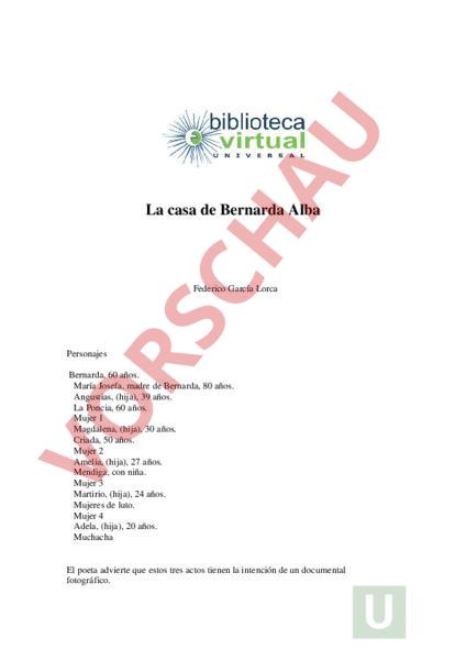 La casa de Bernarda Alba Federico García Lorca Personajes Bernarda, 60 años. María Josefa, madre de Bernarda, 80 años. Angustias, (hija), 39 años. La Poncia, 60 años. Mujer 1 Magdalena, (hija), 30 años. Criada, 50 años. Mujer 2 Amelia, (hija), 27 años. Mendiga, con niña. Mujer 3 Martirio, (hija), 24 años. Mujeres de luto. Mujer 4 Adela, (hija), 20 años. Muchacha El poeta advierte que estos tres actos tienen la intención de un documental fotográfico. Acto Habitación blanquísima del interior de la casa de Bernarda. Muros gruesos. Puertas en arco con cortinas de yute rematadas con madroños volantes. Sillas de anea. Cuadros con paisajes inverosímiles de ninfas reyes de leyenda. Es verano. Un gran silencio umbroso se extiende por la escena. Al levantarse el telón está la escena sola. Se oyen doblar las campanas. (Sale la Criada) Criada: Ya tengo el doble de esas campanas metido entre las sienes. La Poncia: (Sale comiendo chorizo pan) Llevan ya más de dos horas de gori-gori. Han venido curas de todos los pueblos. La iglesia está hermosa. En el primer responso se desmayó la Magdalena. Criada: Es la que se queda más sola. La Poncia: Era la única que quería al padre. ¡Ay! ¡Gracias Dios que estamos solas un poquito! Yo he venido comer. Criada: ¡Si te viera Bernarda.! La Poncia: ¡Quisiera que ahora, que no come ella, que todas nos muriéramos de hambre! ¡Mandona! ¡Dominanta! ¡Pero se fastidia! Le he abierto la orza de chorizos. Criada: (Con tristeza, ansiosa) ¿Por qué no me das para mi niña, Poncia? La Poncia: Entra llévate también un puñado de garbanzos. ¡Hoy no se dará cuenta! Voz (Dentro): ¡Bernarda! La Poncia: La vieja. ¿Está bien cerrada? Criada: Con dos vueltas de llave. La Poncia: Pero debes poner también la tranca. Tiene unos dedos como cinco ganzúas. Voz: ¡Bernarda! La Poncia: (A voces) ¡Ya viene! (A la Criada) Limpia bien todo. Si Bernarda no ve relucientes las cosas me arrancará los pocos pelos que me quedan. Criada: ¡Qué mujer! La Poncia: Tirana de todos los que la rodean. Es capaz de sentarse encima de tu corazón ver cómo te mueres durante un año sin que se le cierre esa sonrisa fría que lleva en su maldita cara. ¡Limpia, limpia ese vidriado! Criada: Sangre en las manos tengo de fregarlo todo. La Poncia: Ella, la más aseada; ella, la más decente; ella, la más alta. Buen descanso ganó su pobre marido. (Cesan las campanas.) Criada: ¿Han venido todos sus parientes? La Poncia: Los de ella. La gente de él la odia. Vinieron verlo muerto, le hicieron la cruz. Criada: ¿Hay bastantes sillas? La Poncia: Sobran. Que se sienten en el suelo. Desde que murió el padre de Bernarda no han vuelto entrar las gentes bajo estos techos. Ella no quiere que la vean en su dominio. ¡Maldita sea! Criada: Contigo se portó bien. La Poncia: Treinta años lavando sus sábanas; treinta años comiendo sus sobras; noches en vela cuando tose; días enteros mirando por la rendija para espiar los vecinos llevarle el cuento; vida sin secretos una con otra, sin embargo, ¡maldita sea! ¡Mal dolor de clavo le pinche en los ojos! Criada: ¡Mujer! La Poncia: Pero yo soy buena perra; ladro cuando me lo dice muerdo los talones de los que piden limosna cuando ella me azuza; mis hijos trabajan en sus tierras ya están los dos casados, pero un día me hartaré. Criada: ese día. La Poncia: Ese día me encerraré con ella en un cuarto le estaré escupiendo un año entero. Bernarda, por esto, por aquello, por lo otro, hasta ponerla como un lagarto machacado por los niños, que es lo que es ella toda su parentela. Claro es que no le envidio la vida. La quedan cinco mujeres, cinco hijas feas, que quitando Angustias, la mayor, que es la hija del primer marido tiene dineros, las demás mucha puntilla bordada, muchas camisas de hilo, pero pan uvas por toda herencia. Criada: ¡Ya quisiera tener yo lo que ellas! La Poncia: Nosotras tenemos nuestras manos un hoyo en la tierra de la verdad. Criada: Ésa es la única tierra que nos dejan las que no tenemos nada. La Poncia: (En la alacena) Este cristal tiene unas motas. Criada: Ni con el jabón ni con bayeta se le quitan. (Suenan las campanas) La Poncia: El último responso. Me voy oírlo. mí me gusta mucho cómo canta el párroco. En el Pater noster subió, subió, subió la voz que parecía un cántaro llenándose de agua poco poco. ¡Claro es que al final dio un gallo, pero da gloria oírlo! Ahora que nadie como el antiguo sacristán, Tronchapinos. En la misa de mi madre, que esté en gloria, cantó. Retumbaban las paredes, cuando decía amén era como si un lobo hubiese entrado en la iglesia. (Imitándolo) ¡Ameeeén! (Se echa toser) Criada: Te vas hacer el gaznate polvo. La Poncia: ¡Otra cosa hacía polvo yo! (Sale riendo) (La Criada limpia. Suenan las campanas) Criada: (Llevando el canto) Tin, tin, tan. Tin, tin, tan. ¡Dios lo haya perdonado! Mendiga: (Con una niña) ¡Alabado sea Dios! Criada: Tin, tin, tan. ¡Que nos espere muchos años. Tin, tin, tan. Mendiga: (Fuerte con cierta irritación) ¡Alabado sea Dios! Criada: (Irritada) ¡Por siempre! Mendiga: Vengo por las sobras. (Cesan las campanas) Criada: Por la puerta se va la calle. Las sobras de hoy son para mí. Mendiga: Mujer, tú tienes quien te gane. ¡Mi niña yo estamos solas! Criada: También están solos los perros viven. Mendiga: Siempre me las dan. Criada: Fuera de aquí. ¿Quién os dijo que entrarais? Ya me habéis dejado los pies señalados. (Se van. Limpia.) Suelos barnizados con aceite, alacenas, pedestales, camas de acero, para que traguemos quina las que vivimos en las chozas de tierra con un plato una cuchara. ¡Ojalá que un día no quedáramos ni uno para contarlo! (Vuelven sonar las campanas) Sí, sí, ¡vengan clamores! ¡venga caja con filos dorados toallas de seda para llevarla!; ¡que lo mismo estarás tú que estaré yo! Fastídiate, Antonio María Benavides, tieso con tu traje de paño tus botas enterizas. ¡Fastídiate! ¡Ya no volverás l