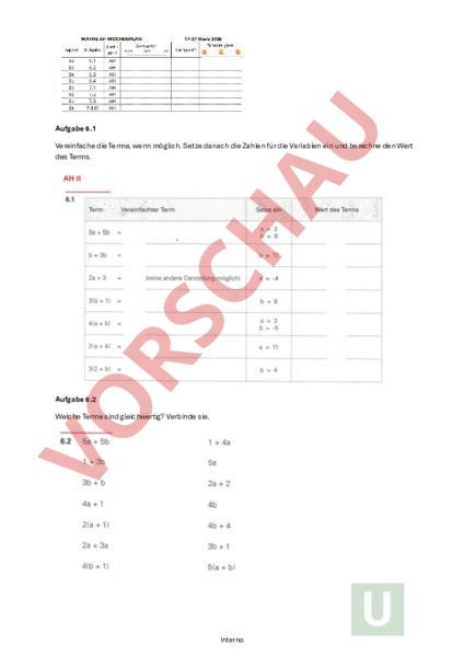 Aufgabe 6.1 Vereinfache die Terme, wenn möglich. Setze danach die Zahlen für die Variablen ein und berechne den Wert des Terms. Aufgabe 6.2 Welche Terme sind gleichwertig? Verbinde sie. Interno Aufgabe 6.3 Ergänze die Rechenmauern. Notiere beim obersten Stein den Term auch in der produktförmigen Schreibweise (klammere aus). Aufgabe 6.4 Vereinfache die Terme. Klammere beim Ergebnis den grösstmöglichen gemeinsamen Faktor aus, falls dies sinnvoll ist. Interno Aufgabe 7.1 Vereinfache die Terme, falls dies möglich ist. Setze danach die Zahlen für die Variablen ein und berechne den Wert des Terms. Aufgabe 7.2 Welche Terme sind gleichwertig? Verbinde sie. Interno Aufgabe 7.3 Vereinfache die Terme so weit wie möglich. Klammere am Schluss den grösstmöglichen gemeinsamen Faktor aus, falls dies sinnvoll ist. Interno Interno Interno Interno