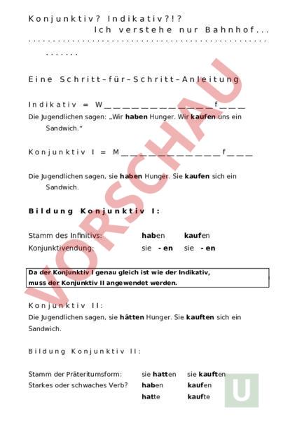 Konjunktiv? Indikativ?!? Ich verstehe nur Bahnhof. . . Eine Schritt–für–Schritt–Anleitung n i a i Die Jugendlichen sagen: „Wir haben Hunger. Wir kaufen uns ein Sandwich. o j n t v Die Jugendlichen sagen, sie haben Hunger. Sie kaufen sich ein Sandwich. Bildung Konjunktiv I: Stamm des Infinitivs: haben kaufen Konjunktivendung: sie en sie en Da der Konjunktiv genau gleich ist wie der Indikativ, muss der Konjunktiv II angewendet werden. Konjunktiv II: Die Jugendlichen sagen, sie hätten Hunger. Sie kauften sich ein Sandwich. Bildung Konjunktiv II: Stamm der Präteritumsform: sie hatten sie kauften Starkes oder schwaches Verb? haben kaufen hatte kaufte gehabt gekauft STARK! SCHWACH! sie hätten sie kauften Bei stark konjugierten Verben werden a, und zu ä, ö und ü! Bei schwach konjugierten Verben entspricht der Konjunktiv II der Präteritumsform! In diesem Fall muss auf die Zweiwortform (würde Infinitiv) ausgewichen werden! Zweiwortform: Die Jugendlichen sagen, sie hätten Hunger. Sie würden sich ein Sandwich kaufen. Partnerarbeit: dreht das Theorieblatt um und erklärt das soeben Gelernte. überprüft, ob verstanden hat! Rollentausch! Mein Partner meine Partnerin hat die Theorie verstanden: Unterschrift: Herr Zimmermann muss meinem Partner meiner Partnerin die Theorie nochmals erklären!
