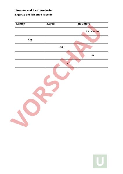 Kantone und ihre Hauptorte Ergänze die folgende Tabelle Kanton Kürzel Hauptort Lausanne Zug GR UR VD