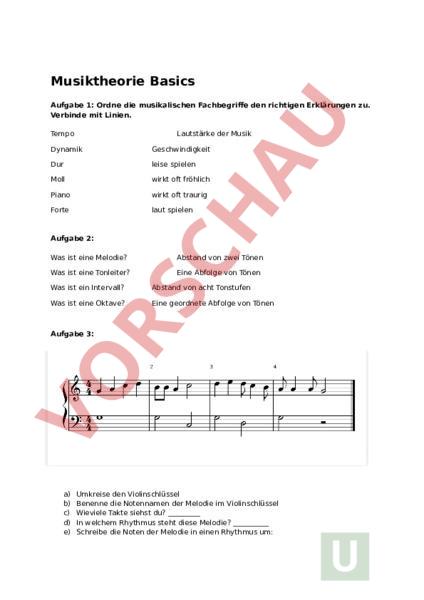 Musiktheorie Basics Aufgabe 1: Ordne die musikalischen Fachbegriffe den richtigen Erklärungen zu. Verbinde mit Linien. Tempo Lautstärke der Musik Dynamik Geschwindigkeit Dur leise spielen Moll wirkt oft fröhlich Piano wirkt oft traurig Forte laut spielen Aufgabe 2: Was ist eine Melodie? Abstand von zwei Tönen Was ist eine Tonleiter? Eine Abfolge von Tönen Was ist ein Intervall? Abstand von acht Tonstufen Was ist eine Oktave? Eine geordnete Abfolge von Tönen Aufgabe 3: a) b) c) d) e) Umkreise den Violinschlüssel Benenne die Notennamen der Melodie im Violinschlüssel Wieviele Takte siehst du? In welchem Rhythmus steht diese Melodie? Schreibe die Noten der Melodie in einen Rhythmus um: