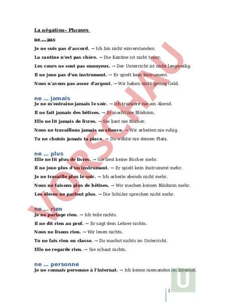 La négation– Phrases ne pas Je ne suis pas daccord. Ich bin nicht einverstanden. La cantine nest pas chère. Die Kantine ist nicht teuer. Les cours ne sont pas ennuyeux. Der Unterricht ist nicht langweilig. Il ne joue pas dun instrument. Er spielt kein Instrument. Nous navons pas assez dargent. Wir haben nicht genug Geld. ne jamais Je ne mentraîne jamais le soir. Ich trainiere nie am Abend. Il ne fait jamais des bêtises. Er macht nie Blödsinn. Elle ne lit jamais de livres. Sie liest nie Bücher. Nous ne travaillons jamais en silence. Wir arbeiten nie ruhig. Tu ne choisis jamais ta place. Du wählst nie deinen Platz. ne plus Elle ne lit plus de livres. Sie liest keine Bücher mehr. Il ne joue plus dun instrument. Er spielt kein Instrument mehr. Je ne travaille plus le soir. Ich arbeite abends nicht mehr. Nous ne faisons plus de bêtises. Wir machen keinen Blödsinn mehr. Les élèves ne parlent plus. Die Schüler sprechen nicht mehr. ne rien Je ne partage rien. Ich teile nichts. Il ne dit rien au prof. Er sagt dem Lehrer nichts. Nous ne lisons rien. Wir lesen nichts. Tu ne fais rien en classe. Du machst nichts im Unterricht. Elle ne regarde rien. Sie schaut nichts. ne personne Je ne connais personne à linternat. Ich kenne niemanden im Internat. 1 Il ne voit personne. Er sieht niemanden. Nous ne connaissons personne ici. Wir kennen hier niemanden. Tu ne parles à personne. Du sprichst mit niemandem. Personne ne travaille en silence. Niemand arbeitet ruhig. A. Complète avec pas jamais plus rien personne 1. Je ne travaille 2. Il ne joue dun instrument. 3. Elle ne lit de livres. 4. Tu ne dis 5. Je ne connais dans la classe. B. Mets à la forme négative 1. Je travaille en silence. 2. Il joue dun instrument. 3. Elle lit des livres. 4. Tu dis tout. 5. Je connais tout le monde. CORRECTION A1. pas A2. jamais A3. plus A4. rien A5. personne B1. Je ne travaille pas en silence. B2. Il ne joue pas dun instrument. B3. Elle ne lit pas de livres. B4. Tu ne dis rien. B5. Je ne connais personne. 2