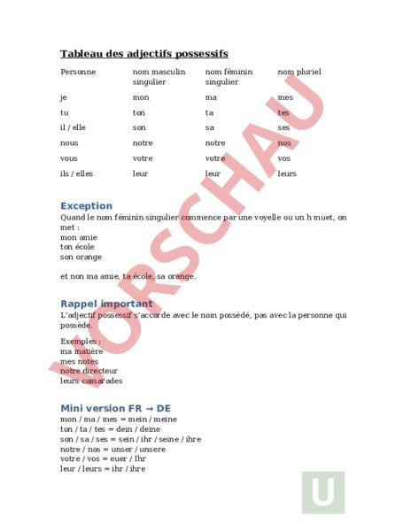 Tableau des adjectifs possessifs Personne nom masculin singulier nom féminin singulier nom pluriel je mon ma mes tu ton ta tes il elle son sa ses nous notre notre nos vous votre votre vos ils elles leur leur leurs Exception Quand le nom féminin singulier commence par une voyelle ou un muet, on met mon amie ton école son orange et non ma amie, ta école, sa orange. Rappel important Ladjectif possessif saccorde avec le nom possédé, pas avec la personne qui possède. Exemples ma matière mes notes notre directeur leurs camarades Mini version FR DE mon ma mes mein meine ton ta tes dein deine son sa ses sein ihr seine ihre notre nos unser unsere votre vos euer Ihr leur leurs ihr ihre