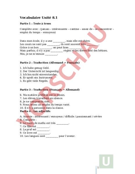 Vocabulaire Unité 8.1 Partie 1 Texte à trous Complète avec (jamais – intéressante – cantine – assez de – se concentrer – emploi du temps – ennuyeux) Dans mon école, il a une , mais elle est chère. Les cours ne sont pas , ils sont souvent très . Grâce à un bon , on peut bien . Mais parfois, il ny pas règles et les élèves font des bêtises. Moi, je ne mennuie . Partie 2 Traduction (Allemand Français) 1. 2. 3. 4. 5. Ich habe genug Geld. Der Unterricht ist langweilig. Ich bin nicht einverstanden. Er spielt ein Instrument. Es gibt viele Regeln. Partie 3 Traduction (Français Allemand) 6. Ma matière préférée est le dessin. 7. Les élèves travaillent en silence. 8. Je ne comprends rien. 9. Nous avons un emploi du temps varié. 10. Il ny personne dans la classe. Partie 4 Les adjectifs A. Associe intéressant ennuyeux difficile passionnant sévère B. Complète 6. Le cours de maths est très . 7. Ce film est . 8. La prof est . 9. Ce livre est . 10. Les langues sont pour lavenir. 1 SOLUTIONS Partie 1 cantine – ennuyeux – intéressante – emploi du temps – se concentrer – assez de – jamais Partie 2 1. Jai assez dargent. 2. Les cours sont ennuyeux. 3. Je ne suis pas daccord. 4. Il joue dun instrument. 5. Il a beaucoup de règles. Partie 3 6. Mein Lieblingsfach ist Zeichnen. 7. Die Schüler arbeiten ruhig. 8. Ich verstehe nichts. 9. Wir haben einen abwechslungsreichen Stundenplan. 10. Es ist niemand in der Klasse. Partie 4 6. difficile 7. passionnant 8. sévère 9. ennuyeux 10. importantes 2