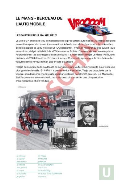 LE MANS BERCEAU DE LAUTOMOBILE LE CONSTRUCTEUR MALHEUREUX La ville du Mans est le lieu de naissance de la production automobile. Au début, les gens avaient très peur de ces véhicules rapides. Afin de les calmer, le constructeur Amédée Bollée appelé sa voiture à vapeur «LObéissante». Il voulait montrer quelle suivait tous ses ordres. Malgré la fiabilité de «LObéissante», Bollée nen vendu aucun exemplaire. Pour présenter les avantages de son véhicule, il même fait le trajet Le Mans–Paris, une distance de 250 kilomètres. En route, il reçu 75 amendes parce que la circulation de voitures sans chevaux nétait pas encore autorisée. Malgré ces revers, Bollée décidé de construire une voiture moins lourde pour viser une plus grande clientèle. En 1878, il presenté «La Mancelle». Toujours propulsée par la vapeur, son deuxième modèle atteignait une vitesse de 30 km/h environ. «La Mancelle» était la première automobile du monde construite en série: une cinquantaine dexemplaires ont été vendus. LES 24 HEURES DU MANS En 1923, un club automobile lancé une course pour favoriser la promotion et lévolution des voitures. Il sagit de la plus ancienne et de la plus prestigieuse des courses dendurance du monde. Depuis le début, la course dure 24 heures. Deux ou trois pilotes par voiture se relayent jour et nuit. La voiture qui parcouru la plus grande distance en 24 heures gagne la course. Pendant les courses, les constructeurs ont toujours testé beaucoup dinnovations dans lespoir de gagner. Entre autres les freins à disques ou les phares antibrouillard ont conquis le monde à partir de la course des 24 Heures du Mans.