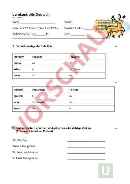 Lernkontrolle Deutsch LP21: D5/5.c Name Datum: Maximum: 28 Punkte (Note 4 ab 17 P.) Erreichte Punkte: Die Schülerinnen und Schüler können regelmässige und unregelmässige Verben bestimmen. können Präsens, Präteritum, Perfekt, Plusquamperfekt und Futur sowie Infinitiv und Personalform benennen und bilden. Selbsteinschätzung: P. Note: 1. Vervollständige die Tabellen. Infinitiv 6 P. Präsens Präsens hören du ich fallen er sie (Plural) haben ihr wir 6 P. Infinitiv Präteritum Perfekt spielen Ich du sein sie (Singular) ihr lesen wir er 2. Unterstreiche die Verben und gib jeweils die richtige Zeit an. (Präsens, Präteritum, Perfekt). Sie fährt Ski. Du hast laut gelacht. Wir liefen nach Hause. Ihr kauft Süssigkeiten. 4 P. 3. Setze die Verben (in der Klammer) ins Präsens und ergänze damit die Sätze. 4 P. Petra (sprechen) mit Freunden. Ihr . (werfen) einen Ball. Du (lösen) die Aufgabe, ich (helfen) dir. 4. Setze die Verben (in der Klammer) ins Präteritum und ergänze damit die Sätze. 3 P. Die Sonne (scheinen) hell. Wir (fragen) den Polizisten. Er (geben) keine Antwort. 5. Setze die Verben ins Perfekt und ergänze damit die Sätze. 3 P. Letzte Woche (haben/sein) wir viele Pausen (brauchen). Sie (haben/sein) heim (gehen). Ihr (haben/sein) ein grosses Loch (graben). 6. Regelmässig oder unregelmässig? Kreuze an, ob das Verb regelmässig oder unregelmässig ist. Verb essen wohnen nehmen erklären regelmässig unregelmässig 2 P.