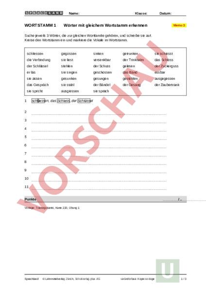 Name: WORTSTAMM 1 Klasse: Datum: Wörter mit gleichem Wortstamm erkennen Memo 3 Suche jeweils 3 Wörter, die zur gleichen Wortfamilie gehören, und schreibe sie auf. Kreise den Wortstamm ein und markiere die Vokale im Wortstamm. schliessen gegossen sinken getrunken sie schiesst die Verbindung sie liest versenkbar der Trinkhalm das Schloss der Schlüssel stehlen der Schuss gelesen der Zuckerguss er las sie singen geschossen das Band essbar sie assen gesunken gesungen gestohlen ausgegessen das Gespräch sie stahl der Bändel der Gesang der Zaubertrank sie spricht ausgiessen sie sprach 1 2 3 4 5 6 7 8 9 10 11 schl iessen, das Schloss, der Schlüssel . . . . . . . . . . Punkte Vorlage: Trainingskartei, Karte 220, Übung 1 Sprachland Lehrmittelverlag Zürich, Schulverlag plus AG veränderbare Kopiervorlage 1/3 Name: WORTSTAMM 1 Klasse: Datum: Wörter mit gleichem Wortstamm erkennen Memo 3 Suche alle Wörter, die zur gleichen Wortfamilie gehören, und schreibe sie auf. Kreise den Wortstamm ein und markiere die Vokale im Wortstamm. das Eis er sprang die Kälte die Erkältung das Eishockey gebrochen die Skijacke das Glatteis zersprungen der Reisekatalog es bricht der Skistock vereist der Verband abbrechen die Sprungschanze die Skibrille nasskalt die Reise verreisen die Eisprinzessin gesprungen der Beinbruch die Skipiste gebunden die Verbindung Wortfamilie 1 Wortfamilie 2 Wortfamilie 3 Wortfamilie 4 Wortfamilie 5 Wortfamilie 6 Wortfamilie 7 Punkte Vorlage: Trainingskartei, Karte 220, Übung 2 Sprachland Lehrmittelverlag Zürich, Schulverlag plus AG veränderbare Kopiervorlage 2/3 Name: WORTSTAMM 1 Klasse: Datum: Wörter mit gleichem Wortstamm erkennen Memo 3 Suche alle Wörter, die zur gleichen Wortfamilie gehören, und schreibe sie auf. Kreise den Wortstamm ein und markiere die Vokale im Wortstamm. gebaut das Mehl mühelos die Mülltonne die Montagsmaler verfärben der Bauer mahlen die Mühe die Mühle die Verfärbung gemahlen die Malerin die Farbe sich bemühen die Müllabfuhr gebraut farbig gefärbt der Müll der Malstift die Brauerei die Überbauung die Bäuerin gemalt das Mühlrad mühevoll Wortfamilie 1 Wortfamilie 2 Wortfamilie 3 Wortfamilie 4 Wortfamilie 5 Wortfamilie 6 Wortfamilie 7 Punkte Vorlage: Trainingskartei, Karte 220, Übung 2 Sprachland Lehrmittelverlag Zürich, Schulverlag plus AG veränderbare Kopiervorlage 3/3