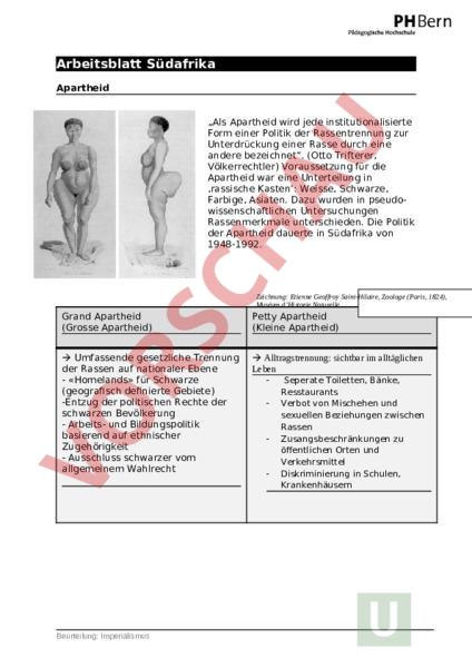 Arbeitsblatt Südafrika Apartheid „Als Apartheid wird jede institutionalisierte Form einer Politik der Rassentrennung zur Unterdrückung einer Rasse durch eine andere bezeichnet. (Otto Trifterer, Völkerrechtler) Voraussetzung für die Apartheid war eine Unterteilung in ‚rassische Kasten‘: Weisse, Schwarze, Farbige, Asiaten. Dazu wurden in pseudowissenschaftlichen Untersuchungen Rassenmerkmale unterschieden. Die Politik der Apartheid dauerte in Südafrika von 1948-1992. Zeichnung: Etienne Geoffroy Saint-Hilaire, Zoologe (Paris, 1824), Muséum dHistorie Naturelle. Grand Apartheid (Grosse Apartheid) Petty Apartheid (Kleine Apartheid) Umfassende gesetzliche Trennung der Rassen auf nationaler Ebene «Homelands» für Schwarze (geografisch definierte Gebiete) -Entzug der politischen Rechte der schwarzen Bevölkerung Arbeits- und Bildungspolitik basierend auf ethnischer Zugehörigkeit Ausschluss schwarzer vom allgemeinem Wahlrecht Alltragstrennung: sichtbar im alltäglichen Alltragstrennung: Alltragstrennung: sichtbar im alltäglichen sichtbar Alltragstrennung: sichtbar im alltäglichen im Alltragstrennung: sichtbar im alltäglichen alltäglichen Alltragstrennung: sichtbar im alltäglichen Leben Beurteilung: Imperialismus Seperate Toiletten, Bänke, Resstaurants Verbot von Mischehen und sexuellen Beziehungen zwischen Rassen Zusangsbeschränkungen zu öffentlichen Orten und Verkehrsmittel Diskriminierung in Schulen, Krankenhäusern Diskussion: Welche Probleme ergaben sich für den südafrikanischen Staat aus der Rassengesetzgebung (und der massiven Machtasymmetrie)? Massive soziale Spannungen und regelmäßige Proteste Internationale Sanktionen und Isolation (wirtschaftlich und diplomatisch) Unterentwicklung großer Teile der Bevölkerung aufgrund systematischer Benachteiligung Hoher Verwaltungsaufwand und Repression zur Aufrechterhaltung des Systems Legitimationskrise der Regierung im In- und Ausland Stellen Sie Vermutungen an: Wie rechtfertigten Weisse diese Politik? Verweis auf „kulturelle Unterschiede und vermeintliche „Unvereinbarkeit Pseudowissenschaftliche Rassentheorien als angeblich biologische Grundlage Religiöse Argumente: göttliche Ordnung, Erwähltheit „Zivilisatorische Mission der Weißen – paternalistischer Anspruch Schutzargumente: Behauptung, man wolle Konflikte durch Trennung vermeiden Wie konnte sich ein derartiges System so lange halten? Gewalt und Unterdrückung (Polizei, Militär, Geheimdienst) Kontrolle über Bildung, Medien und Justiz Spaltung der Gesellschaft durch gezielte Ethnisierung Wirtschaftliche Abhängigkeit vieler Schwarzer (z. B. als billige Arbeitskräfte) Internationale Zurückhaltung bzw. Unterstützung während des Kalten Krieges Strategische Koalitionen mit anderen Kolonialmächten und wirtschaftlichen Interessengruppen Beurteilung: Imperialismus