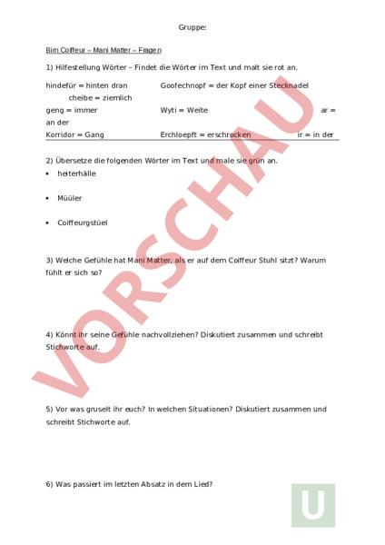 Gruppe: Bim Coiffeur – Mani Matter – Fragen 1) Hilfestellung Wörter – Findet die Wörter im Text und malt sie rot an. hindefür hinten dran Goofechnopf der Kopf einer Stecknadel cheibe ziemlich geng immer Wyti Weite ar an der Korridor Gang Erchloepft erschrocken ir in der 2) Übersetze die folgenden Wörter im Text und male sie grün an. heiterhälle Müüler Coiffeurgstüel 3) Welche Gefühle hat Mani Matter, als er auf dem Coiffeur Stuhl sitzt? Warum fühlt er sich so? 4) Könnt ihr seine Gefühle nachvollziehen? Diskutiert zusammen und schreibt Stichworte auf. 5) Vor was gruselt ihr euch? In welchen Situationen? Diskutiert zusammen und schreibt Stichworte auf. 6) Was passiert im letzten Absatz in dem Lied?
