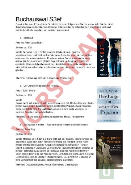 Buchauswal S3ef Du wirst bis zum Ende deiner Schulzeit, eins der folgenden Bücher lesen. Alle Bücher sind Jugendromane mit ähnlichem Umfang. Bitte lies die Beschreibungen sorgfältig durch und wähle das Buch, das dich am meisten interessiert. 1. Blackout Autorin: Alice Gabathuler Seiten: ca. 208 Inhalt: Schwarz. Leer. Einfach nichts. Carla ist weg. Spurlos verschwunden. Und Nick soll schuld sein. Aber der kann sich an nichts erinnern. Nur eines weiss er: Er würde seiner Cousine niemals etwas antun. Weil ihm niemand glaubt, beginnt Nick, auf eigene Faust zu ermitteln. Was er dabei herausfindet, lässt ihn immer mehr zweifeln. An sich selbst, vor allem aber an den Menschen, die er am besten zu kennen glaubte . Themen: Spannung, Schuld, Erinnerung, Vertrauen 2. Der Junge im gestreiften Pyjama Autor: John Boyne Seiten: ca. 216 Inhalt: Bruno zieht mit seiner Familie an einen neuen Ort. Dort entdeckt er hinter einem Zaun einen Jungen in einem gestreiften Pyjama. Zwischen den beiden entsteht eine Freundschaft, obwohl Bruno nicht versteht, in welcher Situation sie sich befinden. Themen: Freundschaft, Nationalsozialismus, Moral, Perspektive 3. Sackgasse Freiheit – Aus dem Leben eines Strassenkindes Autorin: Jana Frey Seiten: ca. 203 Inhalt: Melanie ist 14 Jahre alt und lebt auf der Straße. Schnell muss sie begreifen, dass sich auch hier die Hoffnung auf Freiheit für sie nicht erfüllt. Stattdessen wird ihr Alltag ein einziger Kampf gegen Hunger, Sucht, Einsamkeit und purer Verzweiflung. Immer tiefer gerät Melanie in einen Teufelskreis, aus dem sie sich aus eigener Kraft nicht befreien kann. Doch dann lernt sie Ätze kennen. Einfühlsam erzählt Jana Frey die Geschichte eines deutschen Straßenkindes. So schafft sie Einblicke in eine Wirklichkeit die bewegt, schockiert und aufrüttelt! Themen: Obdachlosigkeit, Armut, Überleben, Gesellschaft 4. Krummer Hund Autorin: Juliane Pickel Seiten: ca. 220 Inhalt: Der 15-jährige Daniel ist vor allem eins: wütend. Sein Vater ist weg, seine Mutter schleppt einen Liebhaber nach dem anderen an. Doc, ihr neuester Freund, ist der Mann, der Daniels Hund eingeschläfert hat. Trotzdem gewinnt Daniel ihn lieb. Bis zu einem tödlichen Unfall nach einer Party, durch den Daniel ein schrecklicher Verdacht kommt. Kann er seinen Erinnerungen an diese Nacht glauben? Oder spiegeln sie nur wider, was er gerne glauben würde? Themen: Wut, Verantwortung, Schuld, Perspektivwechsel 5. Das Haus der Treppen Autor: William Sleator Seiten: ca. 200 Inhalt: Fünf Jugendliche wachen in einem seltsamen Gebäude voller Treppen auf, ohne zu wissen, wie sie dort hingekommen sind. Sie müssen herausfinden, wie sie überleben können, während sie von äußeren Bedingungen und Regeln beeinflusst werden. Dabei wird ihr Verhalten ständig getestet, und sie erleben Gruppendynamik, Macht und Misstrauen hautnah. Themen: Science Fiction, Überleben, Gruppendynamik, Macht Kontrolle, Vertrauen, Identität, psychologische Manipulation Versuche mindestens ein Buch in die ersten beiden Felder einzutragen. Es können auch mehrere Bücher in einer Kategorie stehen, versuche nur deinen Favoriten klar zu zeigen. Yesss! Klingt ok Wenn es sein muss Lieber nicht Nie im Leben