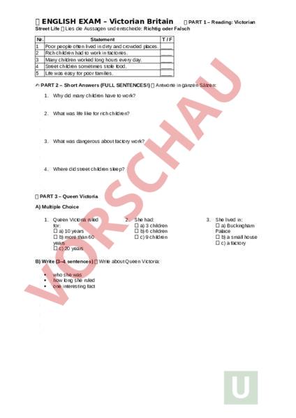 Arbeitsblatt: ENGLISH EXAM – Victorian Britain