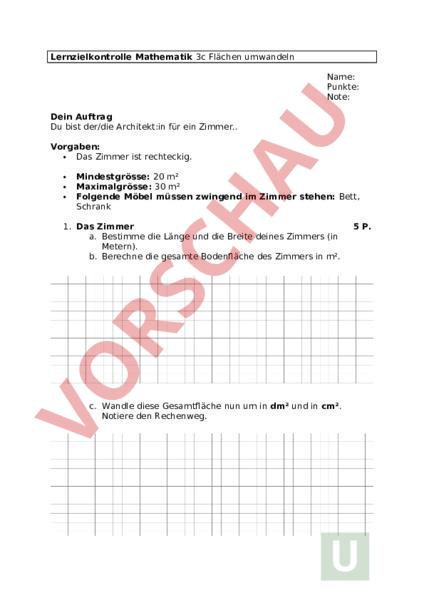 Lernzielkontrolle Mathematik 3c Flächen umwandeln Name: Punkte: Note: Dein Auftrag Du bist der/die Architekt:in für ein Zimmer Vorgaben: Das Zimmer ist rechteckig. Mindestgrösse: 20 m Maximalgrösse: 30 m Folgende Möbel müssen zwingend im Zimmer stehen: Bett, Schrank 1. Das Zimmer a. Bestimme die Länge und die Breite deines Zimmers (in Metern). b. Berechne die gesamte Bodenfläche des Zimmers in m. c. Wandle diese Gesamtfläche nun um in dm und in cm. Notiere den Rechenweg. 5 P. 2. Die Möbel a. Wähle je ein Bett und ein Schrank von dem Katalog aus. b. Berechne die Bodenfläche der Möbel in cm2. Zeige deine Masse und Rechnungsschritte. 5 P. Bett Schrank 3. Der Bauplan 6 P. Zeichne den Grundriss deines Zimmers mit Bleistift und Lineal auf ein weisses Blatt. Wähle dabei den Massstab 1:50. Zeichne alle Möbel massstabsgetreu ein, beschrifte sie sauber und zeichne auch eine Tür und zwei Fenster ein. Notiere den gewählten Massstab gut sichtbar auf dem Blatt. Türbreite: 610mm Fenster: 70 cm 4. *Teppichquadrate* Der Zimmerboden soll mit quadratischen Teppichstücken ausgelegt werden. Ein Teppichstück misst 20cm 20cm. Wie viele Teppichstücke braucht es für das ganze Zimmer? 4 P.