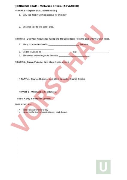 Arbeitsblatt: ENGLISH EXAM – Victorian Britain (ADVANCED