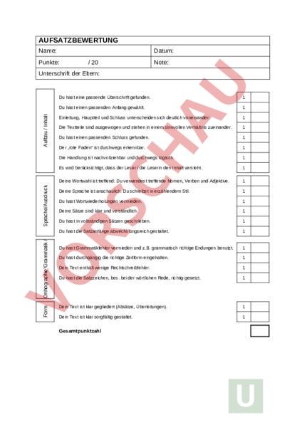 AUFSATZBEWERTUNG Name: Datum: Punkte: 20 Note: Form Orthographie1Grammatik Sprache/Ausdruck Aufbau Inhalt Unterschrift der Eltern: Du hast eine passende Überschrift gefunden. 1 Du hast einen passenden Anfang gewählt. 1 Einleitung, Hauptteil und Schluss unterscheiden sich deutlich voneinander. 1 Die Textteile sind ausgewogen und stehen in einem sinnvollen Verhältnis zueinander. 1 Du hast einen passenden Schluss gefunden. 1 Der „rote Faden ist durchwegs erkennbar. 1 Die Handlung ist nachvollziehbar und durchwegs logisch. 1 Es wird berücksichtigt, dass der Leser die Leserin den Inhalt versteht. 1 Deine Wortwahl ist treffend: Du verwendest treffende Nomen, Verben und Adjektive. 1 Deine Sprache ist anschaulich. Du schreibst in erzählendem Stil. 1 Du hast Wortwiederholungen vermieden. 1 Deine Sätze sind klar und verständlich. 1 Du hast in vollständigen Sätzen geschrieben. 1 Du hast die Satzanfänge abwechslungsreich gestaltet. 1 Du hast Grammatikfehler vermieden und z.B. grammatisch richtige Endungen benutzt. 1 Du hast durchgängig die richtige Zeitform eingehalten. 1 Dein Text enthält wenige Rechtschreibfehler. 1 Du hast die Satzzeichen, bes. bei der wörtlichen Rede, richtig gesetzt. 1 Dein Text ist klar gegliedert (Absätze, Überleitungen). 1 Dein Text ist klar sorgfältig gestaltet. 1 Gesamtpunktzahl