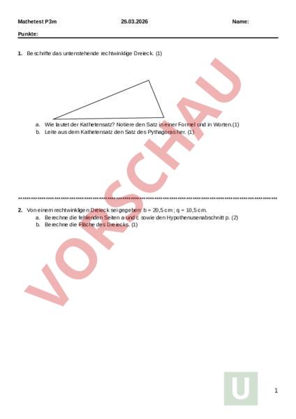 Mathetest P3m 25.03.2026 Name: Punkte: 1. Beschrifte das untenstehende rechtwinklige Dreieck. (1) a. Wie lautet der Kathetensatz? Notiere den Satz in einer Formel und in Worten.(1) b. Leite aus dem Kathetensatz den Satz des Pythagoras her. (1) ************************************************************************************************************************** 2. Von einem rechtwinkligen Dreieck sei gegeben: 20,5 cm q 10,5 cm. a. Berechne die fehlenden Seiten und sowie den Hypothenusenabschnitt p. (2) b. Berechne die Fläche des Dreiecks. (1) 1 Mathetest P3m 25.03.2026 Name: Punkte: 3. Von einem rechtwinkligen Dreieck sei gegeben: 6cm q 14,5 cm. Berechne die fehlenden Seiten (a, b, c) sowie den Hypothenusenabschnitt des Dreiecks. (2) ************************************************************************************************************************** 4. Ein rechtwinkliges Dreieck im Thaleskreis hat eine Fläche von 156 cm2. Die Länge der Höhe hc beträgt 12 cm. Berechne die Seitenlängen und b. (2.5) 2 Mathetest P3m 25.03.2026 Name: Punkte: 5. Gegeben ist ein Rechteck mit der Länge 7 cm un der Breite 3 cm. Verwandle das Rechteck in ein flächengleiches Quadrat. (2) ************************************************************************************************************************** 6. Gegeben sei ein Rechteckt mit s1 4 cm und S2 2cm. Verwandele das Rechteck in ein flächengleiches Quadrat. (2) 3 Mathetest P3m 25.03.2026 Name: Punkte: 7. Berechne die Länge des Streckenzuges – – – (dicke Linie) (4) ************************************************************************************************************************** 8. Das Leuchtfeuer eines Leuchtturms hat die Höhe 100 über der Wasseroberfläche. Aus welcher Entfernung kann ein beobachter auf einem Schiff auf dem Meer – unter Berücksichtigung der Erdkrümmung – das Leuchtfeuer gerade noch sehen? Erdradius 6368 km. (3) 4 Mathetest P3m 25.03.2026 Name: Punkte: Viel Erfolg! 5