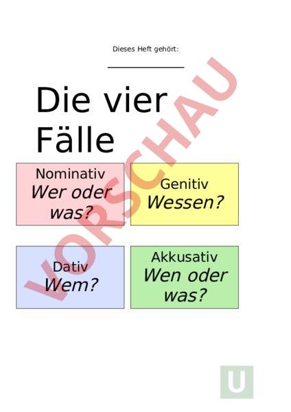 Dieses Heft gehört: Die vier Fälle Nominativ Wer oder was? Dativ Wem? Genitiv Wessen? Akkusativ Wen oder was? Die 4 Fälle Je nachdem, wie Nomen in einem Satz benutzt werden, kommen sie in unterschiedlichen Formen vor. Die Nomen können in 4 Fällen auftreten. Du kannst nach dem Nomen fragen oder die Ersatzprobe anwenden. Die 4 Fälle heissen: 1. Fall 4.Fall Nominativ Wer-Fall Wer oder was? was? 2. Fall 3. Fall Genitiv Wes-Fall Wessen? Dativ Wem-Fall Wem? Akkusativ Wen-Fall Wen oder des Fisches dem Fisch den Fisch die Puppe der Puppe der Puppe die Puppe das Kind des Kindes dem Kind das Kind der Fisch Damit du schnell herausfindest, um welchen Fall es sich handelt, gibt es ein Hilfsmittel: Du kannst zu jedem Fall eine Frage stellen. Fragewörter Fall Wer oder was? Nominativ – das Haus, der Baum, die Blume Wessen? Genitiv – des Hauses, des Baumes, der Blume Wem? Dativ – dem Haus, dem Baum, der Blume Wen oder was? Akkusativ – das Haus, den Baum, die Blume In welchem Fall steht das Nomen? Finde es mit der richtigen Frage heraus. Die Vase steht auf dem Tisch. steht auf dem Tisch? Ich mag gerne Schokokekse. mag ich gerne? Fall Fall Das ist die Tasche meiner Mutter. Tasche ist das?Fall Der Radiergummi gehört Stefan. gehört der Radiergummi? Fall Der Hund ist uns nachgelaufen. Nominativ Wer ist uns nachgelaufen? Der Hut des Vaters hängt am Haken. Peter hilft seiner Schwester. Auf der Fahrt nach Zürich benutzen wir die Eisenbahn. Letzte Woche war das Wetter gut. Das Fahrrad gehört dem Kind des Bäckers. Ich habe den Fotoapparat im Zug liegen lassen. Der Bruder der Mutter ist mein Onkel. Ich will dem Pferd ein Stück Zucker geben. Die Sonne brennt heiss auf die Dächer der Stadt. Ich konnte dem Duft des Kuchens nicht widerstehen._ Unter der Strassenlaterne stand ein Mann. Der Patient braucht dringend einen Arzt._ Auf dem Waldboden lagen schwarze Federn einer Amsel. Die Verkäuferin brachte einer Kundin geduldig Schuh um Schuh zum Anprobieren. Ersatzprobe Bei männlichen Nomen ist es einfacher den Fall zu bestimmen, da man den Fall am Artikel erkennt: der den dem Hund und des Hundes. Bei den weiblichen und sachlichen Nomen ist es etwas schwieriger. Darum brauchen wir die sogenannte Ersatzprobe. Das weibliche oder sachliche Nomen wird dabei durch ein männliches Nomen ersetzt (zum Beispiel: Der Vater). Beispiele: Hast du das Mädchen kämpfen sehen? Hast du den Vater kämpfen sehen? Wen? den Akkusativ Meine Mutter kocht ein gutes Essen. Der Bruder kocht ein gutes Essen. Wer? der Nominativ Ich schenke meiner Mutter ein Buch. Ich schenke meinem Vater ein Buch. Wem? dem Dativ Das Fell der Katze ist weich. Das Fell des Hundes ist weich. Wessen? des Genitiv Mach zwei Beispiele, in welchen du die Ersatzprobe anwendest. Nominativ oder Akkusativ? Bestimme den Fall der Nomen in dem du den Akkusativ grün und den Nominativ rot unterstreichst. Füge anschliessend die fehlenden Endungen an: Die Stadtpolizei Die Stadtpolizei erhielt ei dringen Anruf. Anruf kam vom Mieter eines Wohnblocks. aufgeregt Mieter erzählte, er habe in der Zahnarztpraxis über seiner Wohnung ei verdächtig Lärm gehört. Dies Lärm müsse von einem Einbrecher stammen. Einbrecher sei auch jetzt noch am Wekr. Unmittelbar danach bekam die Polizei zweit Anruf, denn das verdächtige Geräusch hatte noch ei ander Mieter beunruhigt. Sie rückte sofort aus, um Einbrecher auf frischer Tat zu ertappen. möglich Fluchtweg wurde abgeschnitten: An allen wichtigen Punkten stellte man ei Posten auf. verdächtig Lärm wurde nun auch von den Polizisten festgestellt. Als sie in die Praxis eingedrungen waren, fanden sie wirklich ei Übeltäter vor, aber ei sonderbar . Übeltäter, die Mieter gehört hatten und man nun zu überführen glaubte, war nämlich ein Zahnbohrer, vermutlich von einer Putzfrau versehentlich in Betrieb gesetzt worden war. Duch die Vibration musste er auf ei Tisch gefallen sein. Boden war nämlich mit hinuntergefegten Gegenständen bedeckt. Rest konnte man sich leicht vorstellen. sich fröhlich weiterdrehend Bohrer war ebenfalls auf dem Boden gelandet und hatte hier als unfreiwillig Störefried Mieter und Polizei genarrt. Dativ Der Dativ zeigt oft an, wem etwas gehört. Man sucht im Satz die Person oder die Sache, der etwas „zugestossen ist. Man sucht also das „Opfer eines Ereignisses. Beispiel: Der Dieb hat der Frau die Brieftasche gestohlen. Wem hat der Dieb die Brieftasche gestohlen? Der Frau? Dem Onkel? Den Kindern? Versuche nun selber die Lücken mit passenden Nomen zu finden. Das Wort „ihm darfst du jedoch in dieser Übung nicht verwenden. Ich habe einen Preis gegeben. Mein Vater bereitet eine grosse Freude. Dieser Flitzer gehört . Der Lehrer kauft ein Eis. Die Mülltonne ist von umgekippt worden. Das Rathaus von wird renoviert. Du solltest dich bei sofort bedanken. Schreibe nun selber zwei Sätze, in denen der Dativ vorkommt. Stelle bei jedem Beispiel die Wem-Frage und schreibe sie auf. Unterstreiche den Dativ mit blau und zeige es einer Lehrperson. Genitiv Der Genitiv zeigt oft an, wem etwas gehört. Man sucht also den Besitzer eines Gegenstandes. Beispiel: Das Auto meiner Schwester ist schon alt. Wessen Auto ist schon alt? Finde nun selber einige solche Beispiele: Der Hund ist gefährlich. Das Buch steht schon lange Zeit im Regal herum. Der Esel verhält sich seltsam. Der Hut ist zerbeult. Das Haus kostete viel Geld. Einer der Angestellten ist dauernd krank. Der mächtige Baum im Garten wurde gestern gefällt. Die Patienten erholen sich sehr rasch. Schreibe nun selber zwei Sätze, in denen der Genitiv vorkommt. Stelle bei jedem Beispiel die Wessen-Frage und schreibe sie unter den Satz. Unterstreiche den Genitiv mit gelb und zeige es einer Lehrperson. Fragen stellen Welches Fragewort ist das Richtige? Bestimme den Fall der fettgedruckten Wortgruppen durch Erfragen des Falls. Notiere die Frage und den Fall: Nr Sätze 1 Der älteste Sohn des Lehrers malt. 2 Der Ball des kleinen Knaben rollt. 3 Einen älteren