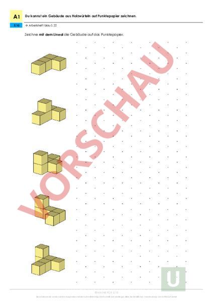 A1 Du kannst ein Gebäude aus Holzwürfeln auf Punktepapier zeichnen. 5.10 Arbeitsheft blau S.22 Zeichne mit dem Lineal die Gebäude auf das Punktepapier. MATHE FOX 5.10 Diese Dokumente wurden nicht in Kooperation mit dem Lehrmittelverlag Zürich erstellt und unterliegen allein der inhaltlichen Verantwortung vom MATHE LZK GmbH