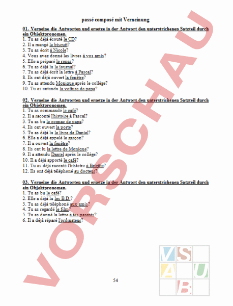 passé composé mit Verneinung 01. Verneine die Antworten und ersetze in der Antwort den unterstrichenen Satzteil durch ein Objektpronomen. 1. Tu as déjà écouté le CD? 2. Il mangé le biscuit? 3. Tu as écrit à Nicole? 4. Vous avez donné les livres à vos amis? 5. Elle préparé le repas? 6. Tu as déjà lu le journal? 7. Tu as déjà écrit la lettre à Pascal? 8. Ils ont déjà ouvert la fenêtre? 9. Tu as attendu Monique après le collège? 10. Tu as entendu la voiture de papa? 02. Verneine die Antworten und ersetze in der Antwort den unterstrichenen Satzteil durch ein Objektpronomen. 1. Tu as commandé le café? 2. Il raconté lhistoire à Pascal? 3. Tu as bu le cognac de papa? 4. Ils ont ouvert la porte? 5. Tu as déjà lu le livre de Daniel? 6. Elle déjà appelé le garçon? 7. Il ouvert la fenêtre? 8. Ils ont lu la lettre de Monique? 9. Il attendu Daniel après le collège? 10. Il déjà apporté le café? 11. Tu as déjà raconté lhistoire à Brigitte? 12. Ils ont déjà téléphoné au docteur? 03. Verneine die Antworten und ersetze in der Antwort den unterstrichenen Satzteil durch ein Objektpronomen. 1. Tu as bu le café? 2. Elle déjà lu les B.D.? 3. Tu as déjà téléphoné aux amis? 4. Tu as regardé le film? 5. Tu as donné la lettre à tes parents? 6. Il déjà réparé lordinateur? 54