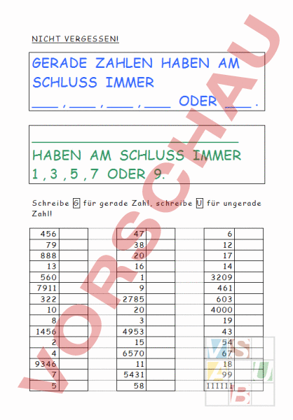 NICHT VERGESSEN! GERADE ZAHLEN HABEN AM SCHLUSS IMMER ODER HABEN AM SCHLUSS IMMER 1 3 5 7 ODER 9. Schreibe für gerade Zahl, schreibe für ungerade Zahl! 456 79 888 13 560 7911 322 10 8 1456 2 4 9346 7 5 47 38 20 16 1 9 2785 20 3 4953 15 6570 11 5431 58 6 12 17 14 3209 461 603 4000 19 43 54 67 18 99 111111