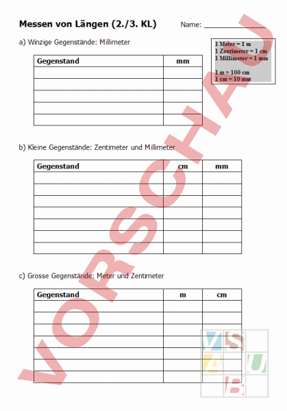 2./3. Klasse: Einführung der Längenmasse durch Protokollierung auf dem Arbeitsblatt.