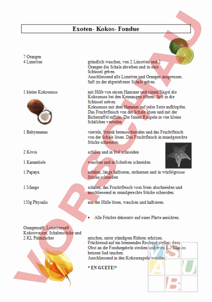 Exoten- Kokos- Fondue 7 Orangen 4 Limetten gründlich waschen, von 2 Limetten und 2 Orangen die Schale abreiben und in eine Schüssel geben. Anschliessend alle Limetten und Orangen auspressen. Saft zu der abgeriebener Schale geben. 1 kleine Kokosnuss mit Hilfe von einem Hammer und einem Nagel die Kokosnuss bei den Keimaugen öffnen. Saft in die Schüssel sieben. Kokusnuss mit dem Hammer auf jeder Seite aufklopfen. Das Fruchtfleisch von der Schale lösen und mit der Bicherraffel raffeln. Die feinen Raspeln in vier kleine Schälchen verteilen. 1 Babyananas vierteln, Strunk herausschneiden und das Fruchtfleisch von der Schale lösen. Das Fruchtfleisch in mundgerechte Stücke schneiden. 2 Kiwis schälen und in 8tel schneiden 1 Karambole waschen und in Scheiben schneiden 1 Papaya schälen, längs halbieren, entkernen und in würfelgrosse Stücke schneiden 1 Mango schälen, das Fruchtfleisch vom Stein abschneiden und anschliessend in mundgerechte Stücke schneiden. 150g Physalis aus der Hülle lösen, waschen und halbieren. • Orangensaft, Limettensaft Kokoswasser, Schalenstücke und 2 KL Palmzucker Alle Früchte dekorativ auf einer Platte anrichten. mischen, unter ständigem Rühren erhitzen. Früchtesud auf ein brennendes Rechaud stellen, dass Obst an die Fonduegabeln stecken und etwa 1-2 Min im heissen Sud tauchen. Anschliessend in den Kokosraspeln wenden. EN GUETE!*