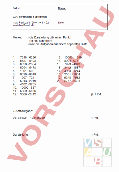 Arbeitsblatt: Test Schriftliche Subtraktion