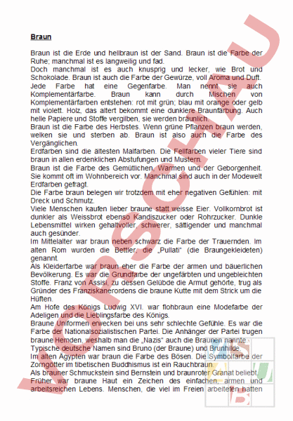 Braun Braun ist die Erde und hellbraun ist der Sand. Braun ist die Farbe der Ruhe; manchmal ist es langweilig und fad. Doch manchmal ist es auch knusprig und lecker, wie Brot und Schokolade. Braun ist auch die Farbe der Gewürze, voll Aroma und Duft. Jede Farbe hat eine Gegenfarbe. Man nennt sie auch Komplementärfarbe. Braun kann durch Mischen von Komplementärfarben entstehen: rot mit grün; blau mit orange oder gelb mit violett. Holz, das altert bekommt eine dunklere Braunfärbung. Auch helle Papiere und Stoffe vergilben, sie werden bräunlich. Braun ist die Farbe des Herbstes. Wenn grüne Pflanzen braun werden, welken sie und sterben ab. Braun ist also auch die Farbe des Vergänglichen. Erdfarben sind die ältesten Malfarben. Die Fellfarben vieler Tiere sind braun in allen erdenklichen Abstufungen und Mustern. Braun ist die Farbe des Gemütlichen, Warmen und der Geborgenheit. Sie kommt oft im Wohnbereich vor. Manchmal sind auch in der Modewelt Erdfarben gefragt. Die Farbe braun belegen wir trotzdem mit eher negativen Gefühlen: mit Dreck und Schmutz. Viele Menschen kaufen lieber braune statt weisse Eier. Vollkornbrot ist dunkler als Weissbrot ebenso Kandiszucker oder Rohrzucker. Dunkle Lebensmittel wirken gehaltvoller, schwerer, sättigender und manchmal auch gesünder. Im Mittelalter war braun neben schwarz die Farbe der Trauernden. Im alten Rom wurden die Bettler, die „Pullati (die Braungekleideten) genannt. Als Kleiderfarbe war braun eher die Farbe der armen und bäuerlichen Bevölkerung. Es war die Grundfarbe der ungefärbten und ungebleichten Stoffe. Franz von Assisi, zu dessen Gelübde die Armut gehörte, trug als Gründer des Franziskanerordens die braune Kutte mit dem Strick um die Hüften. Am Hofe des Königs Ludwig XVI. war flohbraun eine Modefarbe der Adeligen und die Lieblingsfarbe des Königs. Braune Uniformen erwecken bei uns sehr schlechte Gefühle. Es war die Farbe der Nationalsozialistischen Partei. Die Anhänger der Partei trugen braune Hemden, weshalb man die „Nazis auch die Braunen nannte. Typische deutsche Namen sind Bruno (der Braune) und Brunhilde. Im alten Ägypten war braun die Farbe des Bösen. Die Symbolfarbe der Zorngötter im tibetischen Buddhismus ist ein Rauchbraun. Als brauner Schmuckstein sind Bernstein und braunroter Granat beliebt. Früher war braune Haut ein Zeichen des einfachen, armen und arbeitsreichen Lebens. Menschen, die viel im Freien arbeiteten hatten eine sonnengebräunte Haut. Heute ist gebräunte Haut eher ein Privileg der Urlauber und der Besucher der Sonnenstudios. Braun zu sein bedeutet viel Freizeit zu haben, und sich Ferienreisen in ferne, südliche Länder leisten zu können.