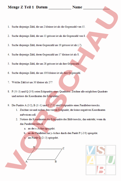 Menge Teil 1 Datum Name 1. Suche diejenige Zahl, die um 2 kleiner ist als die Gegenzahl von 15. 2. Suche diejenige Zahl, die um 13 grösser ist als die Gegenzahl von 8. 3. Suche diejenige Zahl, deren Gegenzahl um 19 grösser ist als (-7). 4. Suche diejenige Zahl, deren Gegenzahl um 17 kleiner ist als 8. 5. Suche diejenige Zahl, die um 28 grösser ist als ihre Gegenzahl. 6. Suche diejenige Zahl, die um 100 kleiner ist als ihre Gegenzahl. 7. Welche Zahl ist um 30 kleiner als 27? 8. ( 0/-3) und (3/0) seien Eckpunkte eines Quadrates. Zeichne alle möglichen Quadrate und notiere die Koordinaten der Eckpunkte. 9. Die Punkte (3/2), (1/-1) und (7/1) sind Eckpunkte eines Parallelenvierecks. 1. Zeichne sie und zudem den vierten Eckpunkt, der keine negativen Koordinaten aufweisen soll. 2. Notiere die Koordinaten der Eckpunkte des Bildvierecks, das entsteht, wenn du das Parallelenviereck a. an der x-Achse spiegelst. b. an der Parallelen zur y-Achse durch den Punkt (-2/0) spiegelst. c. am Punkt (2/-3) spiegelst.