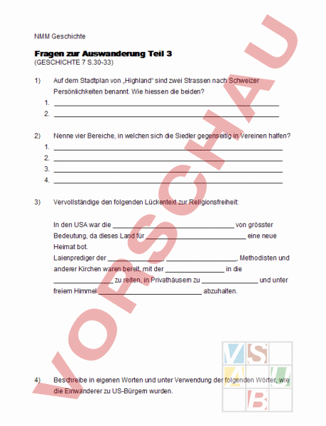 NMM Geschichte Fragen zur Auswanderung Teil 3 (GESCHICHTE 7 S.30-33) 1) Auf dem Stadtplan von „Highland sind zwei Strassen nach Schweizer Persönlichkeiten benannt. Wie hiessen die beiden? 1. 2. 2) Nenne vier Bereiche, in welchen sich die Siedler gegenseitig in Vereinen halfen? 1. 2. 3. 4. 3) Vervollständige den folgenden Lückentext zur Religionsfreiheit: In den USA war die von grösster Bedeutung, da dieses Land für eine neue Heimat bot. Laienprediger der,, Methodisten und anderer Kirchen waren bereit, mit der in die zu reiten, in Privathäusern zu und unter freiem Himmel abzuhalten. 4) Beschreibe in eigenen Worten und unter Verwendung der folgenden Wörter, wie die Einwanderer zu US-Bürgern wurden. ‚Volljährigkeit, ‚fünf Jahre, ‚achtzehnjährig, ‚Verfassung der Vereinigten Staaten, ‚amtliche Bestätigung, ‚zwei Zeugen und ‚unbescholten 5) Wann und warum begann die Eroberung des Westens der USA?, weil gefunden wurde!