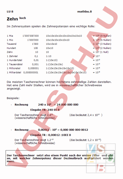 LU 8 mathbu.8 Zehn hoch Im Zehnersystem spielen die Zehnerpotenzen eine wichtige Rolle: 1 Mia 1 00 00 00 1 Mio 1 00 00 Tausend 1 00 Hundert 100 Zehn 10 1 Zehntel 0,1 1 Hundertstel 0,01 1 Tausendstel 0,001 1 Millionstel 1 Milliardstel 0,000001 0,000000001 10x10x10x10x10x10x10x10x10 109 (9 Nullen) 10x10x10x10x10x10 106 (6 Nullen) 10x10x10 103 (3 Nullen) 10x10 102 (2 Nullen) 10 101 (1 Null) 1:10 10-1 1:(10x10) 10-2 1:(10x10x10x) 10-3 1:(10x10x10x10x10x10) 10-6 1:(10x10x10x10x10x10x10x10x10) 10-9 Die meisten Taschenrechner können höchstens zehnstellige Zahlen darstellen. Hat eine Zahl mehr Stellen, wird sie in wissenschaftlicher Schreibweise angezeigt. Beispiele: Rechnung 240 108 24 000 000 000 Eingabe TR: 240 EE 8 Der Taschenrechner zeigt 2,410 (wissenschaftliche Schreibweise). Rechnung: (das bedeutet 2,4 1010 0,00012 108 0,000 000 000 0012 Eingabe TR 0,00012 :10EE 8 Der Taschenrechner zeigt 1,2-13 (wissenschaftliche Schreibweise) (das bedeutet 1,2 10-13) Der Taschenrechner setzt also einen Punkt nach der ersten Ziffer und gibt an, mit welcher Zehnerpotenz dieser Dezimalbruch multipliziert werden muss.