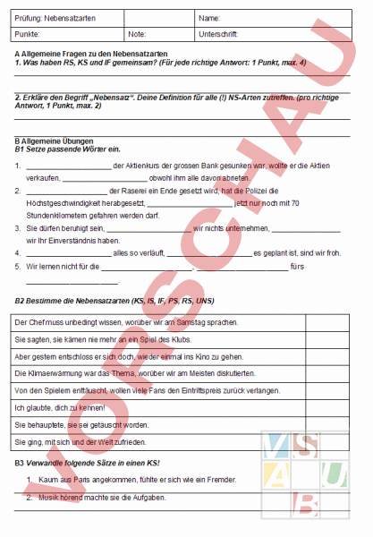 Prüfung: Nebensatzarten Punkte: Name: Note: Unterschrift: Allgemeine Fragen zu den Nebensatzarten 1. Was haben RS, KS und IF gemeinsam? (Für jede richtige Antwort: 1 Punkt, max. 4) 2. Erkläre den Begriff „Nebensatz. Deine Definition für alle (!) NS-Arten zutreffen. (pro richtige Antwort, 1 Punkt, max. 2) Allgemeine Übungen B1 Setze passende Wörter ein. 1. der Aktienkurs der grossen Bank gesunken war, wollte er die Aktien verkaufen, obwohl ihm alle davon abrieten. 2. der Raserei ein Ende gesetzt wird, hat die Polizei die Höchstgeschwindigkeit herabgesetzt, jetzt nur noch mit 70 Stundenkilometern gefahren werden darf. 3. Sie dürfen beruhigt sein, wir nichts unternehmen, wir Ihr Einverständnis haben. 4. alles so verläuft, es geplant ist, sind wir froh. 5. Wir lernen nicht für die, fürs. B2 Bestimme die Nebensatzarten (KS, IS, IF, PS, RS, UNS) Der Chef muss unbedingt wissen, worüber wir am Samstag sprachen. Sie sagten, sie kämen nie mehr an ein Spiel des Klubs. Aber gestern entschloss er sich doch, wieder einmal ins Kino zu gehen. Die Klimaerwärmung war das Thema, worüber wir am Meisten diskutierten. Von den Spielern enttäuscht, wollen viele Fans den Eintrittspreis zurück verlangen. Ich glaubte, dich zu kennen! Sie behauptete, sie sei getäuscht worden. Sie ging, mit sich und der Welt zufrieden. B3 Verwandle folgende Sätze in einen KS! 1. Kaum aus Paris angekommen, fühlte er sich wie ein Fremder. 2. Musik hörend machte sie die Aufgaben. Bestimme die Nebensatzarten und setze, wo notwendig, ein Komma. Verwende die dir bereits bekannten, folgenden Abkürzungen. KS IS RS IF UNS PS 1. 2. 3. 4. 5. 6. 7. 8. 9. 10. 11. 12. 13. 14. 15. VIEL ERFOLG!