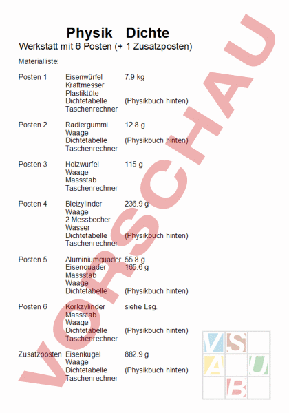 Werkstatt mit 7 Posten zum Thema 'Dichte'. Materialliste und Lösungen vorhanden.