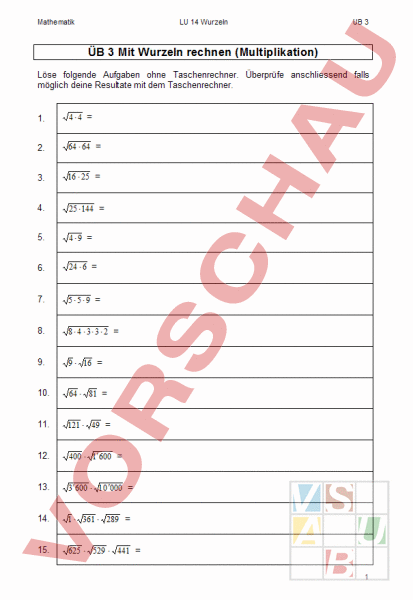 Arbeitsblatt: ÜB 3 Mit Wurzeln rechnen (Multiplikation)