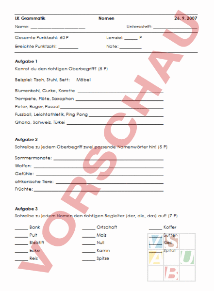 LK Grammatik Nomen Name: 26. 9. 2007 Unterschrift: Gesamte Punktzahl: 60 Lernziel: Erreichte Punktzahl: Note: Aufgabe 1 Kennst du den richtigen Oberbegriff? (5 P) Beispiel: Tisch, Stuhl, Bett: Möbel Blumenkohl, Gurke, Karotte Trompete, Flöte, Saxophon Peter, Roger, Pascal Fussball, Leichtathletik, Ping Pong Ghana, Schweiz, Türkei Aufgabe 2 Schreibe zu jedem Oberbegriff zwei passende Namenwörter hin! (5 P) Sommermonate: Waffen: Gefühle: afrikanische Tiere: Früchte: Aufgabe 3 Schreibe zu jedem Nomen den richtigen Begleiter (der, die, das) auf! (7 P) Bank Ortschaft Koffer Pult Mais Butter Bleistift Null Kies Ecke Kamin Spital Reis Spitze Aufgabe 4 Suche im folgenden Text alle Nomen und übermale sie braun. (13 P) mein dorf ist sehr klein. es liegt am rande eines grossen stroms. man kann das wasser des flusses nicht benützen, weil es trübe ist. darum hat mein grossvater einen brunnen gegraben. er liegt in der mitte des hofes und ist sehr tief. seine tiefe beträgt etwa zehn meter. grosse steinplatten liegen rundherum. wenn man wasser schöpfen will, bindet man einen eimer an das ende des langen seils. in meinem dorf liegt die nächste quelle weit entfernt im wald. so benützen alle bauern das wasser aus diesem brunnen. oft kommen die frauen mit ihren eimern und plaudern und lachen. der brunnen bringt so die menschen zusammen. deshalb liebe ich diese wasserstelle. Aufgabe 5 Bilde Nomen mit den folgenden Endungen: -heit, -keit, -ung, -nis (8 P) sicher finster überraschen langsam ehrlich verwalten geheim blind Aufgabe 6 Wie heissen die zusammengesetzten Nomen? (8 P) Eine Schüssel aus Plastik Milch vom Schaf Ein Kasten für Briefe Schuhe um zu wandern Ein Auto der Post Zucker in Würfel Ein Buch mit Telefonnummern Ein Gipfel mit Mandelfüllung Aufgabe 7 Fülle die Einzahl – Mehrzahl – Tabelle richtig aus! (10 P) Einzahl Mehrzahl das Heft die Königin das Zeugnis der Atlas das Baum der Zug der Computer der Punkt die Geheimnisse die Köchinnen Aufgabe 8 Verwandle die folgenden Verben und Adjektive in Nomen. Brauche jedes Wort genau einmal. (4 P) neu spielen rennen klein essen schwimmen schön lustig Beispiel: nichts Gutes das Lachen zum viel beim etwas am wenig vom nichts