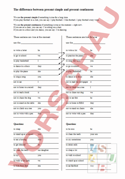 The difference between present simple and present continuous We use the present simple if something is true for long time. If you play football in club, you can say: play football. like football. play football every week. We use the present continuous if something is true at the moment – right now. If you are on chair, you can say: Im sitting on chair. If you are in disco and you dance, you can say: Im dancing. These senteces are true at the moment These sentences are true for ever use the use the to write letter he to write lot he to go to school we to practise the piano she to play basketball to sing very nice you to dance in disco they to go to school we to play the piano she to play basketball he to sing song you to dance in disco she not to eat not to read the newspaper it not to listen to record they not to climb on tree not to read book it not to chase our dog we not to chase the dog we not to eat fish he not to stand on the table she not to listen to REM they not to climb on tree you not to stand on chairs she not to write with pen they not to write with pen they Questions Questions to sleep she to be nice he to stand up at concert you to clean the teeth your son to eat hotdog they to cry sometimes you to get dressed he to drink milk they to clean the teeth our daughter to sleep lot she to cry you to walk to school we to walk to the park we to stand up at school you to hide from Ben she to eat fastfood they