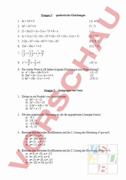 Gruppe 1: quadratische Gleichungen 1. 4x 5x2 0 0; -4/5) 2. 3x2 – 147 0 (7; -7) 3. (2 – 5x).(3 x) – 2.(x – 7)2 8 – (-) 4. (x 1).(x 2) – (3x – 2)2 (2x – 1)2 (3x – 1).(x 1) (1; 2/15) 5. 3.(2x – 2)2 (4x – 6)2 7.(3x – 4)2 (8/5; 8/7) 6. 15x2 – 38x 7 0 (1/5; 7/3) 5 5 10 7. . x 3 3 3 (-) 8. 2 23 3 x 0 4 2 (-6; ) 9. Für welche Werte liefern folgende Gleichungen eine Doppellösung? (-3; -1) a) x2 2kx – (4k3) 0 (2) b) 2kx2 (k – 1).x – 1 0 2 (1/9; 1) c) kx (3k – 1).x 1 0 Gruppe 2: Satzgruppe von Vieta 1. Zerlege in ein Produkt von Linearfaktoren: a) 6x2 – – 12 b) 2x2 – 15x 25 c) 0,2x2 4,8x 19 d) 3x2 x – 2 2. Gib eine quadratische Gleichung an, die die angegebenen Lösungen besitzt: a) -9; 1 b) 1/8; 14 c) –3/2; 4/5 d) –5; -33 3. Berechne den fehlenden Koeffizienten und die 2. Lösung der Gleichung x2pxq0 a) p 3/2; x1 b) q -360; x1 18 c) p 21 x1 -15 d) p 1/3; x1 2/3 4. Berechne den fehlenden Koeffizienten und die 2. Lösung der Gleichung ax2bxc0 a) a 6; c -20; x1 -5/2 b) b -65; c 8; x1 8 c) a 25; b 20; x1 -2/5 d) b -29; c 56; x1 8/3 Gruppe 3: quadratische Gleichungen mit Bruchtermen 1. 3x 1 5 26 2 2 3 4 2 5 12 (7; -1) 2. 2 5 3x 8 3x 2 9 6 2 4 2 x 2) 2 .( 2) (-4) 3. 1 3x 4 20 10 2 4x 6 2 2x x 6 (2; 3) 4. x3 x4 2 2 2 25 5 x 5) (2,5; 9) 5. 2x 2 4x 1 2 3x 8 3 3 (-3; -0,5) 6. 3x 9 7 11x 8 2 2 x3 9 x 3) (4) 2 Gruppe 4: quadratische Gleichungen mit Formvariablen 1. (x – a)2 (x – 1)2 (a – 1)2 (1; a) 2. ax2 – (2 a2).x 2a 0 (2/a; a) 3. 4x2 – 3a2x 0 (0; 3a2/4) 4. 2x2 (a – a2/3).x – a3/6 0 (-a/2; a2/6) 5. a 4 2 2ax 2 ax ax x2 (a/2) 6. 2a x 2a 8a 2 2 2a x 4a 1 (-4a2; 1) 7. ax 5 ax 2 (a; -2a) 8. 5a 2a 2 2 2 xa a xa (7a) 9. 2a 3 x a2 2 xa xa x2 (a/2) Gruppe 5: Textaufgaben 1. Die Summe der Quadrate zweier aufeinanderfolgender natürlicher Zahlen ist um 243 größer als das Doppelte der kleineren Zahl. Wie heißen die Zahlen? (11, 12) 2. Subtrahiert man vom Produkt zweier Zahlen, die sich um 2 unterscheiden, das Doppelte der kleineren Zahl, so erhält man 529. Berechne die beiden Zahlen! (23, 25; -23, -21) 3. Wenn man die Seite eines Quadrats um 5cm verlängert und die andere Seite um 5cm verkürzt, so erhält man ein Rechteck mit dem Flächeninhalt 600cm2. Berechne die Quadratseite! (25cm) 4. In einem Rechteck ist die Länge um 4cm größer als die Breite. Wenn man die Breite um 4cm verkürzt und die Länge unverändert lässt, so erhält man ein Rechteck mit dem Flächeninhalt 768cm2. Berechne die Seitenlängen des ursprünglichen Rechtecks! (32, 28) 5. Von einem Rechteck kennt man das Verhältnis der Seiten und die Länge der Diagonale. Berechne den Umfang und den Flächeninhalt des Rechtecks! a) 5:12; 52cm (136, 960) b) 4:3; 40cm (112, 768) 6. Zerlege die Zahl 24 in zwei Summanden, deren Produkt 135 beträgt. (9, 15) 7. Der Zähler eines Bruches ist um 3 kleiner als sein Nenner. Vermehrt man sowohl den Zähler als auch den Nenner um2, so erhält man einen zweiten Bruch, der um 0,9 kleiner ist als der Reziprokwert des ursprünglichen. Wie lautet dieser? (5/8) 8. Die Differenz der Längen der beiden Seiten eines Rechtecks beträgt 5cm; dieses Rechteck hat einen Flächeninhalt von 150cm2. Wie lang sind die Seiten? (10, 15) 9. In einem rechtwinkeligen Dreieck ist die eine Kathete um 7cm kürzer als die andere; die Hypotenuse ist um 2cm länger als die längere Kathete. Wie lang sind die Seiten? (8, 15, 17) 10. Auf einem rechteckigen Grundstück von 40m Länge und 32m Breite soll ein Schwimmbecken gebaut werden, das von einem überall gleich breiten Grünstreifen umgeben sein soll. Der Flächeninhalt des Grünstreifens soll 40% des Gesamtflächeninhalts betragen. Wie breit muss der Grünstreifen gewählt werden? (4m) 11. Ein Flugzeug fliegt mit einer Geschwindigkeit von 300km/h zu einem 560km entfernten Ziel und gleich wieder zurück. Beim Hinflug hat es Gegenwind, beim Rückflug Rückenwind gleicher Stärke. Für Hin- und Rückflug benötigt es 3h 45min. a) Wie groß war die Windgeschwindigkeit? b) Wie groß war die Geschwindigkeit über Grund beim Hinflug und beim Rückflug? c) Wie groß war die mittlere Geschwindigkeit? Vergleiche sie mit den unter b) berechneten Geschwindigkeiten! a) 20 b) 320 c) 298 2/3 km/h) 12. Wenn ein Flugzeug seine Geschwindigkeit um 24km/h erhöht, dann verringert sich die Flugzeit für eine 480 km lange Strecke um 5 Minuten. Wie groß war die ursprüngliche Geschwindigkeit? (360 km/h)