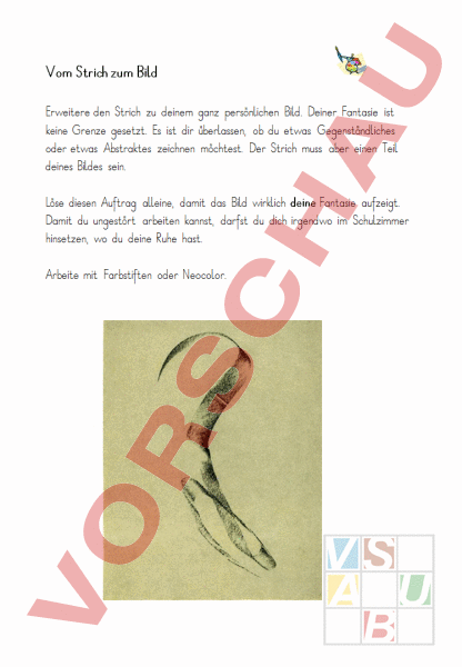 Vom Strich zum Bild Erweitere den Strich zu deinem ganz persönlichen Bild. Deiner Fantasie ist keine Grenze gesetzt. Es ist dir üerlassen, o du etwas Gegenständliches oder etwas Astraktes zeichnen möchtest. Der Strich muss aer einen Teil deines Bildes sein. Löse diesen Auftrag alleine, damit das Bild wirklich deine Fantasie aufzeigt. Damit du ungestört areiten kannst, darfst du dich irgendwo im Schulzimmer hinsetzen, wo du deine Ruhe hast. Areite mit Farstiften oder Neocolor.