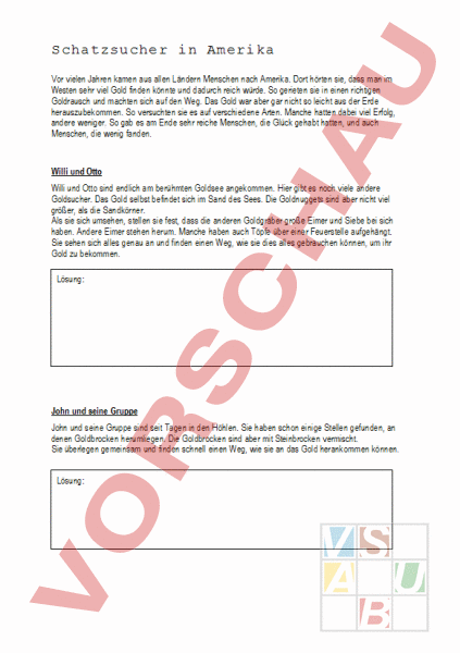 Schatzsucher in Amerika Vor vielen Jahren kamen aus allen Ländern Menschen nach Amerika. Dort hörten sie, dass man im Westen sehr viel Gold finden könnte und dadurch reich würde. So gerieten sie in einen richtigen Goldrausch und machten sich auf den Weg. Das Gold war aber gar nicht so leicht aus der Erde herauszubekommen. So versuchten sie es auf verschiedene Arten. Manche hatten dabei viel Erfolg, andere weniger. So gab es am Ende sehr reiche Menschen, die Glück gehabt hatten, und auch Menschen, die wenig fanden. Willi und Otto Willi und Otto sind endlich am berühmten Goldsee angekommen. Hier gibt es noch viele andere Goldsucher. Das Gold selbst befindet sich im Sand des Sees. Die Goldnuggets sind aber nicht viel größer, als die Sandkörner. Als sie sich umsehen, stellen sie fest, dass die anderen Goldgräber große Eimer und Siebe bei sich haben. Andere Eimer stehen herum. Manche haben auch Töpfe über einer Feuerstelle aufgehängt. Sie sehen sich alles genau an und finden einen Weg, wie sie dies alles gebrauchen können, um ihr Gold zu bekommen. Lösung: John und seine Gruppe John und seine Gruppe sind seit Tagen in den Höhlen. Sie haben schon einige Stellen gefunden, an denen Goldbrocken herumliegen. Die Goldbrocken sind aber mit Steinbrocken vermischt. Sie überlegen gemeinsam und finden schnell einen Weg, wie sie an das Gold herankommen können. Lösung: Frau Cherie aus Frankreich Frau Cherie aus Frankreich ist eine nette Dame. Auf ihrer Reise hat sie viele Menschen kennen gelernt. Darunter auch nette Indianer. Diese Indianer haben ihr an einem Fluss glänzende Steine gezeigt, die angeschwemmt wurden und nun große Haufen bilden. Weil diese aber von trockenem Laub und von losem Sand umgeben sind, muss sie sie erst davon befreien, um die Goldsteine mitnehmen zu können. Das ist ganz einfach und schon bald ist sie sehr reich. Lösung: James Trapper An einem großen Wasserfall, mitten in der Wildnis zeltet ein zerzaust aussehender Mann, James Trapper. Eines Tages will er schwimmen gehen, als er es im Sand glitzern sieht. Sofort denkt er an seine Ausrüstung und weiß, wie er die Kieselgroßen Goldnuggets vom Sand trennen kann. Als reicher Mann kehrt er nach Hause zurück. Lösung: Herr Mondo aus Italien In der Nähe eines Eisenbergwerks wohnen einige Familien. Manchmal gehen sie in das Bergwerk und schauen, ob sie auch etwas finden. Eines Tages sieht Herr Mondo aus Italien einen kleinen Haufen, der glitzert. Es ist Goldstaub. Aber zwischen dem schönen Gold sind auch viele kleine Eisenspäne, die ihn stören und den Wert des Goldes geringer machen. Zum Glück weiß er sich ganz einfach zu helfen und kann später einen großen Sack reines Gold verkaufen. Lösung: Lösungsblatt – Schatzsucher in Amerika Vor vielen Jahren kamen aus allen Ländern Menschen nach Amerika. Dort hörten sie, dass man im Westen sehr viel Gold finden könnte und dadurch reich würde. So gerieten sie in einen richtigen Goldrausch und machten sich auf den Weg. Das Gold war aber gar nicht so leicht aus der Erde herauszubekommen. So versuchten sie es auf verschiedene Arten. Manche hatten dabei viel Erfolg, andere weniger. So gab es am Ende sehr reiche Menschen, die Glück gehabt hatten, und auch Menschen, die wenig fanden. Willi und Otto Willi und Otto sind endlich am berühmten Goldsee angekommen. Hier gibt es noch viele andere Goldsucher. Das Gold selbst befindet sich im Sand des Sees. Die Goldnuggets sind aber nicht viel größer, als die Sandkörner. Als sie sich umsehen, stellen sie fest, dass die anderen Goldgräber große Eimer und Siebe bei sich haben. Andere Eimer stehen herum. Manche haben auch Töpfe über einer Feuerstelle aufgehängt. Sie sehen sich alles genau an und finden einen Weg, wie sie dies alles gebrauchen können, um ihr Gold zu bekommen. Lösung: Zuerst die grossen Steine aussortieren. Material im Wasser in die Töpfe über Feuerstelle geben. Die Hitze des Feuers bringt das Wasser zum verdampfen. Die Mischung, welche zurück bleibt sieben und so Sand und Gold trennen. John und seine Gruppe John und seine Gruppe sind seit Tagen in den Höhlen. Sie haben schon einige Stellen gefunden, an denen Goldbrocken herumliegen. Die Goldbrocken sind aber mit Steinbrocken vermischt. Sie überlegen gemeinsam und finden schnell einen Weg, wie sie an das Gold herankommen können. Lösung: Mit speziellem Schlagwerkzeug die Goldnuggets aus dem Fels herausschlagen. Frau Cherie aus Frankreich Frau Cherie aus Frankreich ist eine nette Dame. Auf ihrer Reise hat sie viele Menschen kennen gelernt. Darunter auch nette Indianer. Diese Indianer haben ihr an einem Fluss glänzende Steine gezeigt, die angeschwemmt wurden und nun große Haufen bilden. Weil diese aber von trockenem Laub und von losem Sand umgeben sind, muss sie sie erst davon befreien, um die Goldsteine mitnehmen zu können. Das ist ganz einfach und schon bald ist sie sehr reich. Lösung: Das Laub aussortieren und anschliessend die Goldsteine sieben um vom Sand zu trennen. James Trapper An einem großen Wasserfall, mitten in der Wildnis zeltet ein zerzaust aussehender Mann, James Trapper. Eines Tages will er schwimmen gehen, als er es im Sand glitzern sieht. Sofort denkt er an seine Ausrüstung und weiß, wie er die Kieselgroßen Goldnuggets vom Sand trennen kann. Als reicher Mann kehrt er nach Hause zurück. Lösung: Gold waschen – Mit einer sogenannten Pfanne. Material in die Pfanne nehmen, mit Wasser füllen und vorsichtig schwenken. Vorgang immer wieder Wiederholen. Gold bleibt am Boden der Pfanne liegen, weil es schwerer ist als der Sand. Herr Mondo aus Italien In der Nähe eines Eisenbergwerks wohnen einige Familien. Manchmal gehen sie in das Bergwerk und schauen, ob sie auch etwas finden. Eines Tages sieht Herr Mondo aus Italien einen kleinen Haufen, der glitzert. Es ist Goldstaub. Aber zwischen dem schönen Gold sind auch viele kleine Eisenspäne, die ihn stören und den Wert des Goldes geringer machen. Zum Glück weiß er sich ganz e