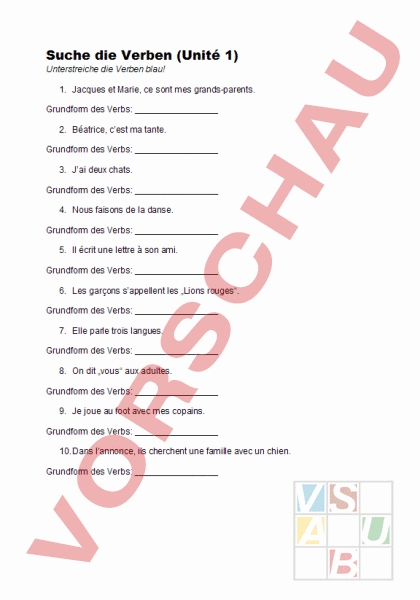Suche die Verben (Unité 1) Unterstreiche die Verben blau! 1. Jacques et Marie, ce sont mes grands-parents. Grundform des Verbs: 2. Béatrice, cest ma tante. Grundform des Verbs: 3. Jai deux chats. Grundform des Verbs: 4. Nous faisons de la danse. Grundform des Verbs: 5. Il écrit une lettre à son ami. Grundform des Verbs: 6. Les garçons sappellent les „Lions rouges. Grundform des Verbs: 7. Elle parle trois langues. Grundform des Verbs: 8. On dit „vous aux adultes. Grundform des Verbs: 9. Je joue au foot avec mes copains. Grundform des Verbs: 10. Dans lannonce, ils cherchent une famille avec un chien. Grundform des Verbs: