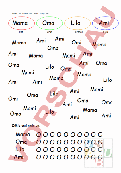 Suche die Wörter und kreise richtig ein: Mama Oma rot grün Ami Mama Ami Oma Mama Ami Oma Ami Oma Mami Ami Oma Lilo blau Omi Mami Oma Mama Lilo Ami orange Lilo Mami Omi Lilo Mama Ami Ami Mama Oma Ami Lilo Mami Ami Ami Oma Mama Oma Ami Zähle und male an: Mama Oma Lilo Ami OOOOOOOOOO OOOOOOOOOO OOOOOOOOOO OOOOOOOOOO Suche die Wörter und kreise richtig ein: Mia Mimi Lama im grün orange blau rot Mia Mimi Mia Lama Lama im Mia Mia Mia Mimi Lama im im Lama Lama Mia Mimi Lama im im Mia Lama Lama Mimi Mimi im Mimi Mia Mimi Mia im im Lama Mia im Zähle und male an: Mia Mimi Lama im OOOOOOOOOO OOOOOOOOOO OOOOOOOOOO OOOOOOOOOO