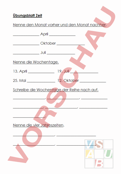 Übungsblatt Zeit Nenne den Monat vorher und den Monat nachher. April Oktober Juli Nenne die Wochentage. 13. April 19. Juli 25. Mai 12. Oktober Schreibe die Wochentage der Reihe nach auf.,, ,, . Nenne die vier Jahreszeiten. , , Das Jahr Es hat Tage. Es hat Wochen. Es hat Monate. Rechne in Wochen und Monaten. Jeder Monat hat ungefähr vier Wochen. Vier Monate haben Wochen. Neun Monate haben Wochen. Fünf Monate haben Wochen. Rechne in Wochen und Tagen. Jede Woche hat sieben Tage. Drei Wochen haben Tage. Sechs Wochen haben Tage. Zehn Wochen haben Tage. Wie viele Wochen und Tage sind das? 19 Tage sind Wochen und Tage. 43 Tage sind Wochen und Tage. 69 Tage sind Wochen und Tage.