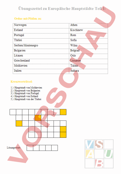 Übungszettel zu den Europäischen Hauptstädten mit Rätseln