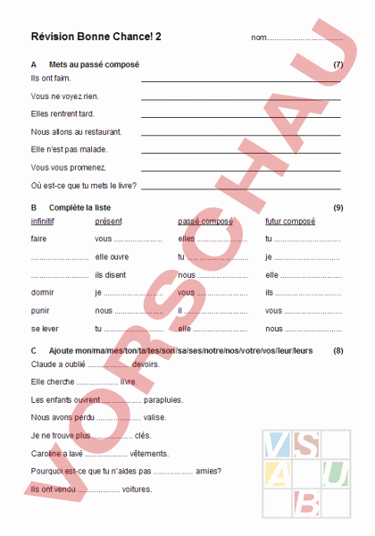 Révision Bonne Chance! 2 nom Mets au passé composé (7) Ils ont faim. Vous ne voyez rien. Elles rentrent tard. Nous allons au restaurant. Elle nest pas malade. Vous vous promenez. Où est-ce que tu mets le livre? Complète la liste (9) infinitif présent passé composé futur composé faire vous . elles tu . . elle ouvre tu . je . . ils disent nous elle . dormir je vous ils . punir nous . il vous . se lever tu elle nous . Ajoute mon/ma/mes/ton/ta/tes/son/sa/ses/notre/nos/votre/vos/leur/leurs Claude oublié devoirs. Elle cherche livre. Les enfants ouvrent . parapluies. Nous avons perdu . valise. Je ne trouve plus . clés. Caroline lavé vêtements. Pourquoi est-ce que tu naides pas . amies? Ils ont vendu voitures. (8) Mets du/de la/de ou des (8) Je prends thé avec peu lait et beaucoup sucre. Est-ce que tu veux fruits ou crème au chocolat? Jaimerais deux tranches jambon, pain avec beurre. Remplace les mots en italique (6) un veston brun une veste une veste brune les beaux vélos les voitures un prof sportif une classe le voyage dangereux laventure des sacs légers des valises un pantalon long une jupe des lits bas des tables Mets toute la phrase au pluriel (12) Cest un hôpital pour ton animal. Le château est très vieux. Prends ce journal et ton manteau. Le cadeau de mon ami me plaît. Traduis en français (10) Pascal ist mein bester Freund. Claire ist netter als Monique. Diese Schuhe sind billig. Wir glauben, dass er lügt. Die Mädchen sind letzte Woche abgereist.