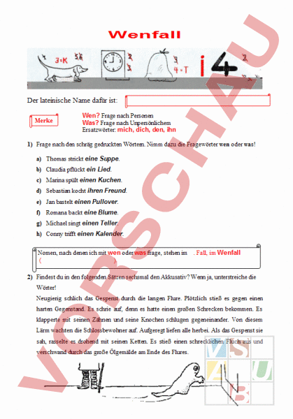 Wenfall Der lateinische Name dafür ist: Merke Wen? Frage nach Personen Was? Frage nach Unpersönlichem Ersatzwörter: mich, dich, den, ihn 1) Frage nach den schräg gedruckten Wörtern. Nimm dazu die Fragewörter wen oder was! a) Thomas strickt eine Suppe. b) Claudia pflückt ein Lied. c) Marina spült einen Kuchen. d) Sebastian kocht ihren Freund. e) Jan bastelt einen Pullover. f) Romana backt eine Blume. g) Michael singt einen Teller. h) Conny trifft einen Kalender. Nomen, nach denen ich mit wen oder was frage, stehen im ). Fall, im Wenfall 2) Findest du in den folgenden Sätzen sechsmal den Akkusativ? Wenn ja, unterstreiche die Wörter! Neugierig schlich das Gespenst durch die langen Flure. Plötzlich stieß es gegen einen harten Gegenstand. Es schrie auf, denn es hatte einen großen Schrecken bekommen. Es klapperte mit seinen Zähnen und seine Knochen schlugen gegeneinander. Von diesem Lärm wachten die Schlossbewohner auf. Aufgeregt liefen alle herbei. Als das Gespenst sie sah, rasselte es drohend mit seinen Ketten. Es stieß einen schrecklichen Fluch aus und verschwand durch das große Ölgemälde am Ende des Flures.