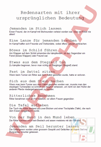 Arbeitsblatt: Redensarten aus der Ritterzeit