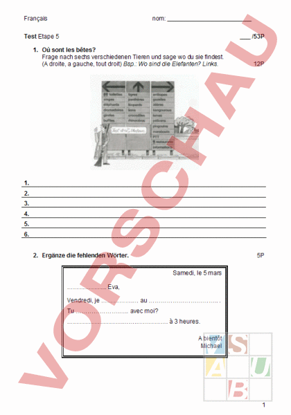Français nom: Test Etape 5 /53P 1. Où sont les bêtes? Frage nach sechs verschiedenen Tieren und sage wo du sie findest. (A droite, gauche, tout droit) Bsp.: Wo sind die Elefanten? Links. 12P 1. 2. 3. 4. 5. 6. 2. Ergänze die fehlenden Wörter. 5P Samedi, le 5 mars Eva, Vendredi, je . au Tu . avec moi? . à 3 heures. bientôt Michael 1 Français nom: 3. Quest-ce que cest? Devine! 3P a. Cest gris et très très petit. Ça court très vite. Ça peur (angst) des chats. Cest b. Cest au zoo. Ça grimpe et ça mange des bananes. Cest c. Ça court, ça saute et ça galope (galopiert) Cest 4. Des/les? Setze den richtigen Artikel ein: a. b. c. d. e. 5P Lauto, le vélo est lautobus sont . véhicules. En hiver (Winter) oiseaux vole en sud (fliegen nach Süden). Jai vu tous matchs (Match) de YB. Berne il a beaucoup musées. lAfrique il a beaucoup crocodiles. 5. Combinez. Verbinde die Sätze mit Pfeilen und schreibe sie ab. 1. la poste 2. Au cinéma 3. Au zoo 4. Au cirque 5. lécole 10P il a des crocodiles. il a des acrobates. il a des professeurs. il a des films. il a des paquettes et des lettres. 1. 2. 3. 4. 5. 6. Übersetze auf Deutsch. 8P 1. Il ne marche pas. 2. Une lettre pour toi. 3. Un écureuil et un arbre. 4. Cest peut-être un lion. 2 Français nom: 7. Bennene die Körperteile: 10P 1. 6. 2. 7. 3. 8. 4. 9. 5. 10. Bonne Chance! 3 Français nom: Lösung 1. Où sont les bêtes? Frage nach sechs verschiedenen Tieren und sage wo du sie findest. (A droite, gauche, tout droit) Bsp.: Wo sind die Elefanten? Links. 12P 1. 2. 3. 4. 5. 6. 2. Ergänze die fehlenden Wörter. 5P Samedi, le 5 mars Bonjour SalutEva, Vendredi, je vais. au zoo Tu viens. avec moi? Rendez-vous à 3 heures. bientôt Michael 4 Français nom: 3. Quest-ce que cest? Devine! Schreibe die Lösung auf Französisch. 3P a. Cest gris et très très petit. Ça court très vite. Ça peur (angst) des chats. Cest une souris b. Cest au zoo. Ça grimpe et ça mange des bananes. Cestun singe c. Ça court, ça saute et ça galope (galopiert) Cest un cheval 4. Des/les? Setze den richtigen Artikel ein: f. g. h. i. j. 5P Lauto, le vélo est lautobus sont des. véhicules. En hiver (Winter) les oiseaux vole en sud (fliegen nach Süden). Jai vu tous les matchs (Match) de YB. Berne il a beaucoup des musées. lAfrique il a beaucoup des crocodiles. 5. Combinez. Verbinde die Sätze mit Pfeilen und schreibe sie ab. 1. la poste 2. Au cinéma 3. Au zoo 4. Au cirque 5. lécole 10P il a des crocodiles. il a des acrobates. il a des professeurs. il a des films. il a des paquettes et des lettres. 1. la post il a des paquettes et des lettres. 2. Au cinéma il a des films. 3. Au zoo il a des crocodiles. 4. Au cirque il a des acrobates. 5. lécole il a des professeurs. 6. Übersetze auf Deutsch. 5. Il ne marche pas. Es läuft nicht. 6. Une lettre pour toi. Ein Brief für dich. 7. Un écureuil et un arbre. Ein Eichhörnchen und ein Baum. 8. Cest peut-être un lion. Es ist vielleicht ein Löwe. 8P 5 Français nom: 7. Bennene die Körperteile: 10P 1. un genou 6. un pied 2. une oreille 7. une bouche 3. une main 8. un nez 4. une jambe 9. un cou 5. une tête 10. un bras 6