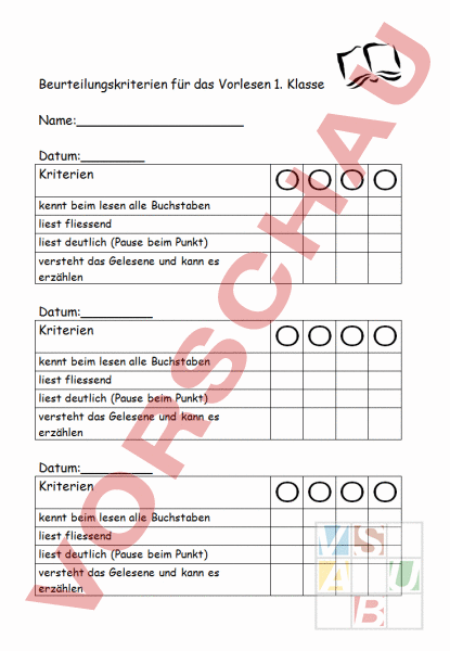 Arbeitsblatt: Beurteilung: Vorlesen 1-3 Klasse