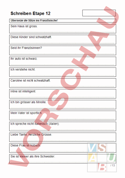 Schreiben Etape 12 Übersetze die Sätze ins Französische! Sein Haus ist gross. . Diese Kinder sind schwatzhaft. . Seid ihr Französinnen? . Ihr auto ist schwarz. . Ich verstehe nicht. . Caroline ist nicht schwatzhaft. . Irène ist intelligent. . Ich bin grösser als Mireille. . Mein Vater ist sportlich. . Ich spreche nicht italienisch (italien). . Liebe Tante, herzliche Grüsse. . Diese Frau ist hübsch. . Sie ist kleiner als ihre Schwester. . 13 Paolo schwatzt nicht während des Unterrichts. . Wir sind die Klasse 6d. . Das sind fröhliche Burschen. . Sie ist weniger sportlich als Pierre. . Ein Affe klettert, er fliegt nicht. . Der Lehrer ist nicht zufrieden. . Sie sind süss, diese Bonbons. . Aber der Salat ist salzig. . /8 Setze die fehlenden Adjektive ein! Achte dabei auf die Schreibweise! gai grande intelligents sportif /6