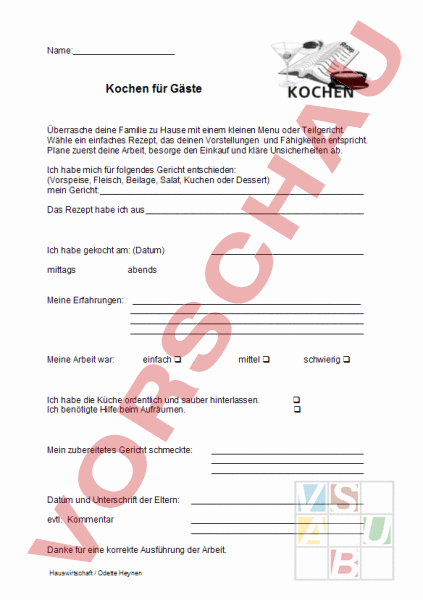 Name:_ Kochen für Gäste Überrasche deine Familie zu Hause mit einem kleinen Menu oder Teilgericht. Wähle ein einfaches Rezept, das deinen Vorstellungen und Fähigkeiten entspricht. Plane zuerst deine Arbeit, besorge den Einkauf und kläre Unsicherheiten ab. Ich habe mich für folgendes Gericht entschieden: (Vorspeise, Fleisch, Beilage, Salat, Kuchen oder Dessert) mein Gericht: Das Rezept habe ich aus Ich habe gekocht am: (Datum) mittags abends Meine Erfahrungen: Meine Arbeit war: einfach mittel Ich habe die Küche ordentlich und sauber hinterlassen. Ich benötigte Hilfe beim Aufräumen. Mein zubereitetes Gericht schmeckte: schwierig Datum und Unterschrift der Eltern: evtl. Kommentar Danke für eine korrekte Ausführung der Arbeit. Hauswirtschaft Odette Heynen
