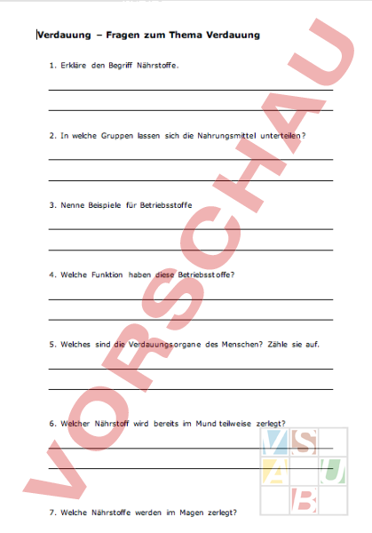 Verdauung – Fragen zum Thema Verdauung 1. Erkläre den Begriff Nährstoffe. 2. In welche Gruppen lassen sich die Nahrungsmittel unterteilen? 3. Nenne Beispiele für Betriebsstoffe 4. Welche Funktion haben diese Betriebsstoffe? 5. Welches sind die Verdauungsorgane des Menschen? Zähle sie auf. 6. Welcher Nährstoff wird bereits im Mund teilweise zerlegt? 7. Welche Nährstoffe werden im Magen zerlegt? 8. Woraus bestehen die Magensäfte? 9. Welche Funktion hat der Gallensaft und wo wird er gebildet? 10. Welche Funktion haben die Säfte der Bauchspeicheldrüse. Wohin werden sie abgegeben? 11. Was passiert im Dünndarm mit dem flüssigen Speisebrei? 12. Kennst du einige Erkrankungen der Verdauungsorgane. 13. Beschreibe kurz drei Erkrankungen der Verdauungsorgane 14. Welche Aufgaben haben die Verdauungssäfte? 15. Welches „Spezialwerkzeug kennst du, das der Körper verwendet, um auf einen bestimmten Bestandteil der Nahrung einzuwirken. 16. Was ist die Funktion von Eiweisen?. In welchen Nahrungsmitteln kommt Eiweiss vor? 17. Welche Funktionen haben Kohlenhydrate und Fette im Körper? 18. Welche Funktionen haben Vitamine im Körper?